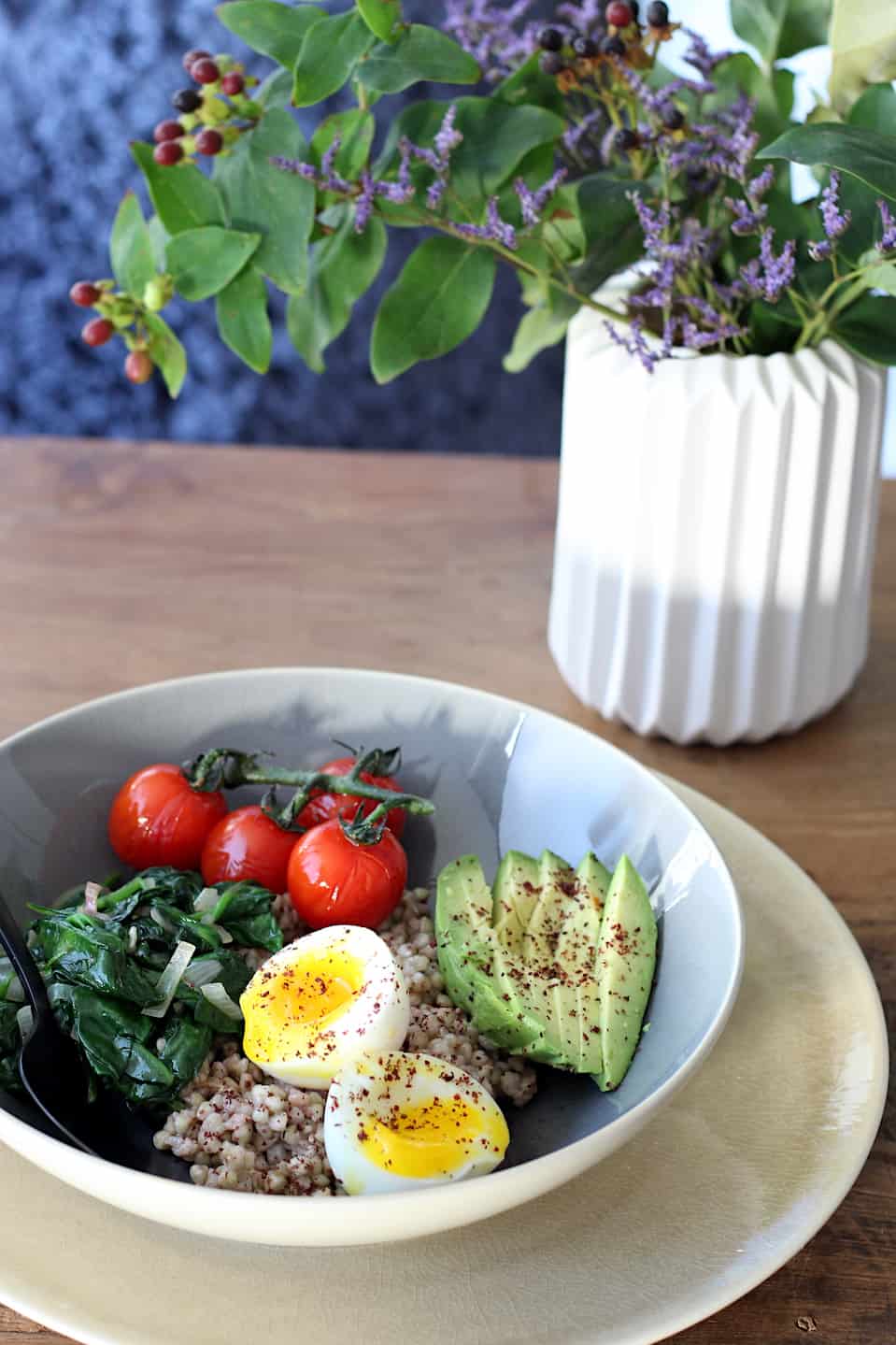5. Meng een scheutje olijfolie extra vergine door de boekweit en verdeel deze over 2 kommetjes. Garneer met spinazie, cherrytomaten en plakjes avocado. Pel de eieren, halveer ze en leg ook in de kommetjes. Strooi eventueel nog wat sumak over het gerecht en val direct aan.