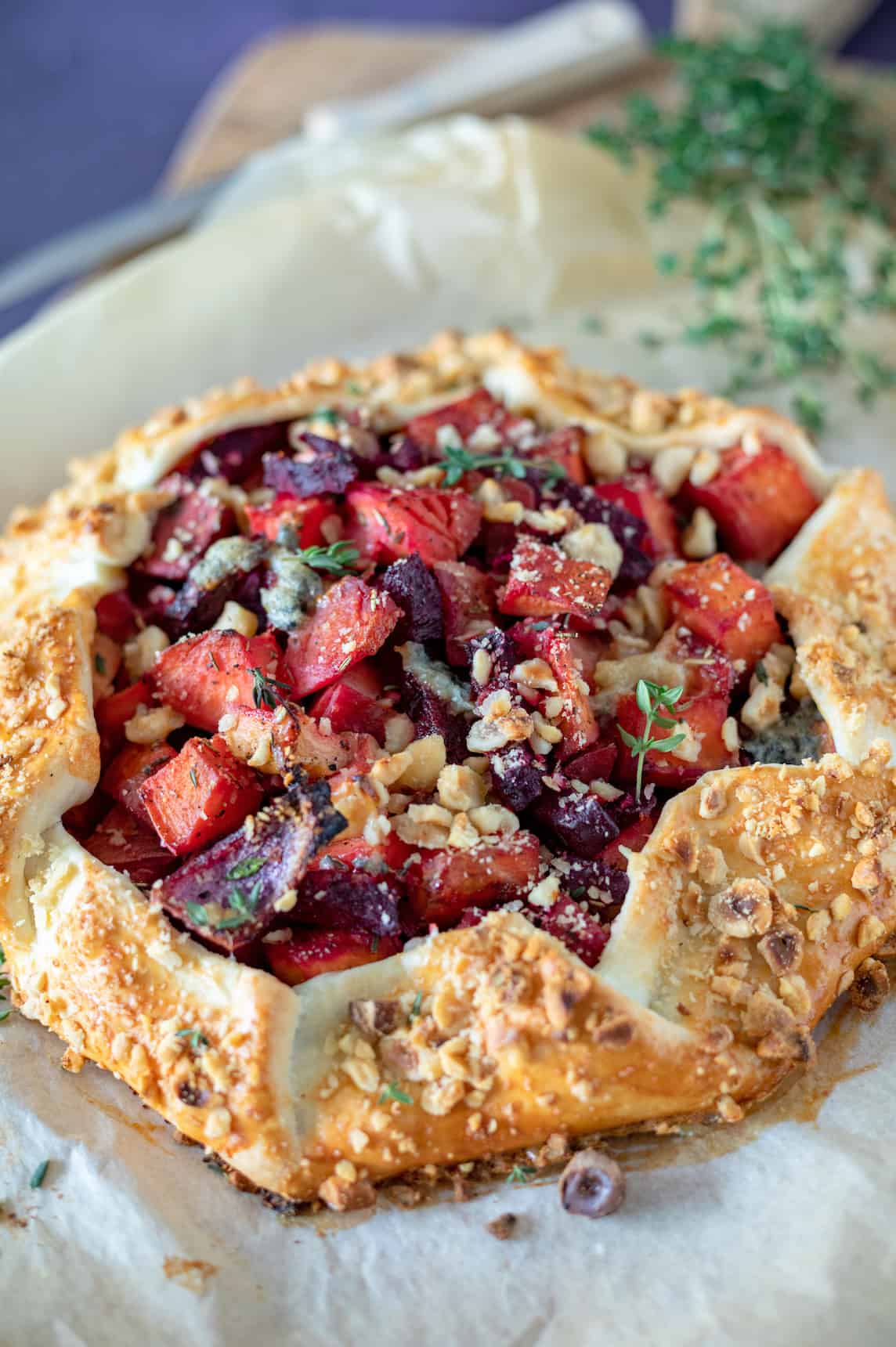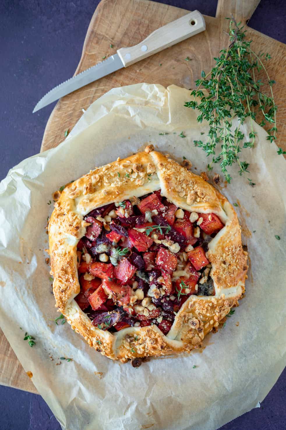 Mijn hartige galette vulde ik met een mengsel van gebakken zoete aardappel met rode biet, rode ui en kruiden. Daar ging ook nog wat appel door en ik combineerde de vulling met gorgonzola én hazelnoten. Alles in het bladerdeeg en de oven deed de rest van het werk… het eindresultaat was zalig! Heerlijk voor een vegetarische doordeweekse dag, maar je kunt er net zo goed de show mee stelen tijdens een weekendborrel of een feestelijke brunch. Geniet ervan!