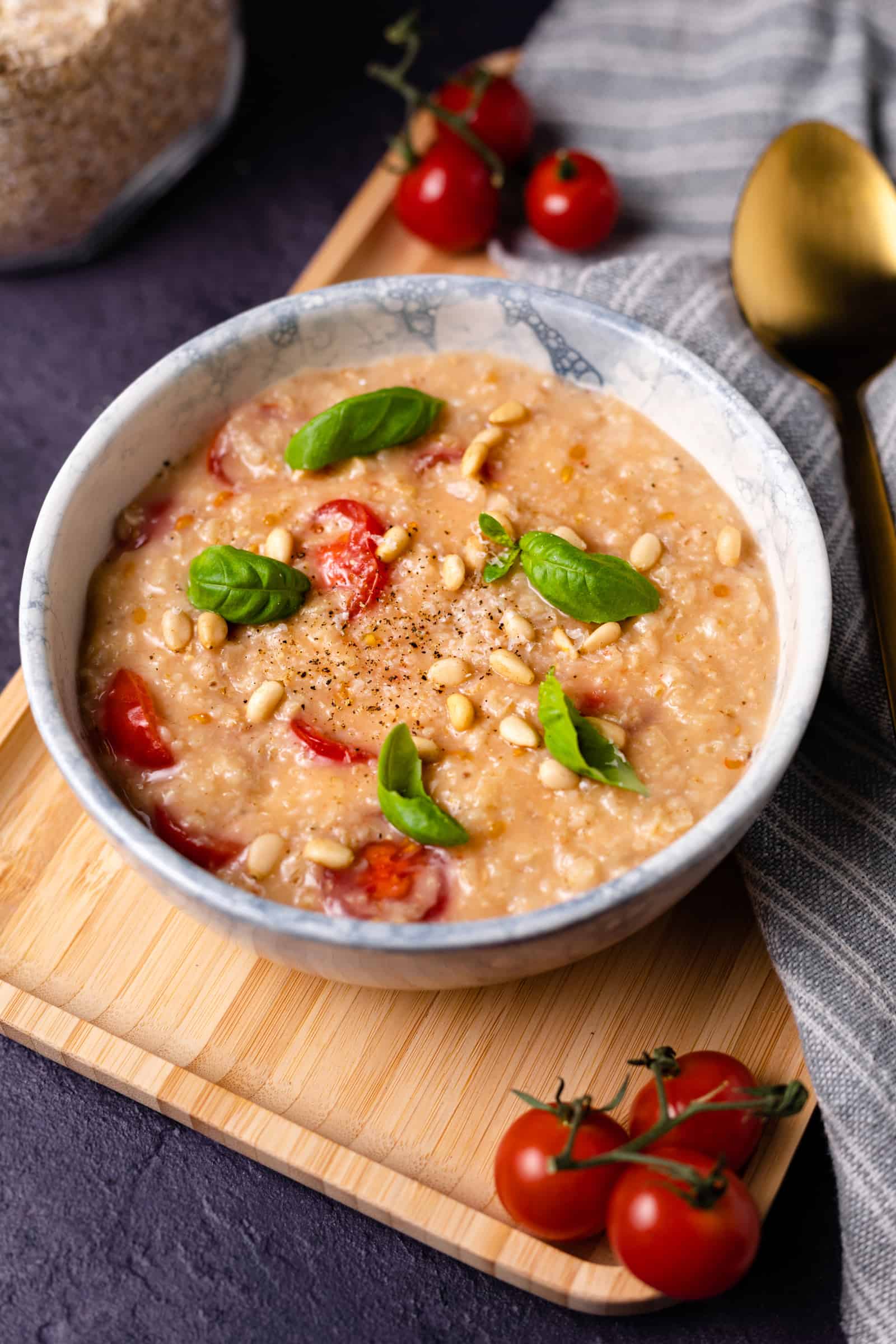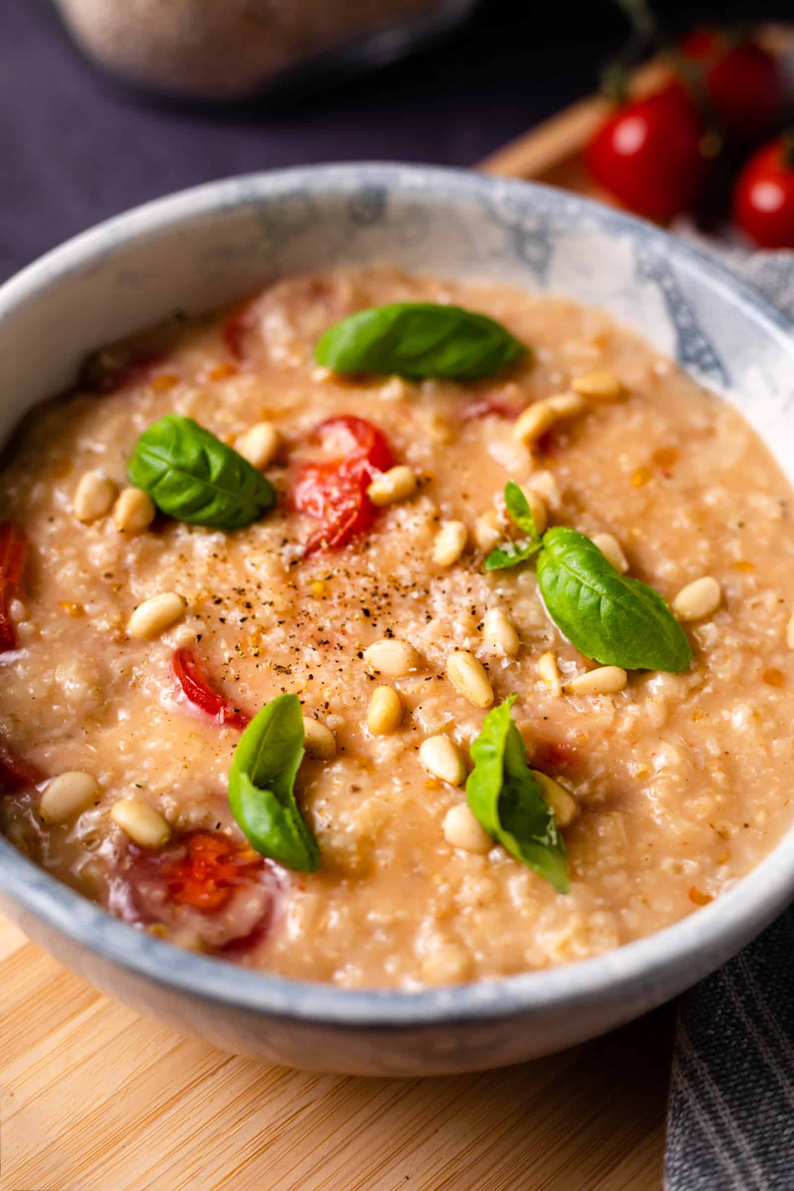 - Serveer de hartige havermout in een kom en garneer met de pijnboompitten, een snufje zwarte peper (naar smaak) en wat blaadjes basilicum.