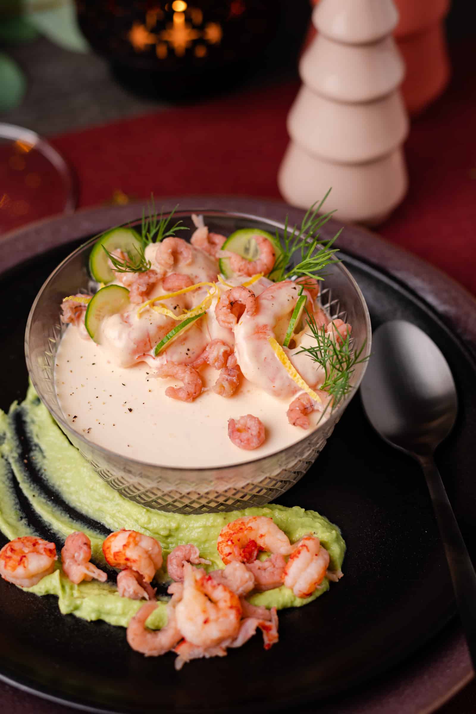 Ik denk dat deze hartige panna cotta misschien wel mijn favoriete nieuwe kerstgerecht van dit jaar is! Doordat de panna cotta zo goed qua smaak combineerde met de garnalen en het weer eens een nieuwe manier van presenteren is van de klassieke garnalencocktail. Ook is het gerecht heel makkelijk te maken, goed voor te bereiden en het ziet er spectaculair uit.