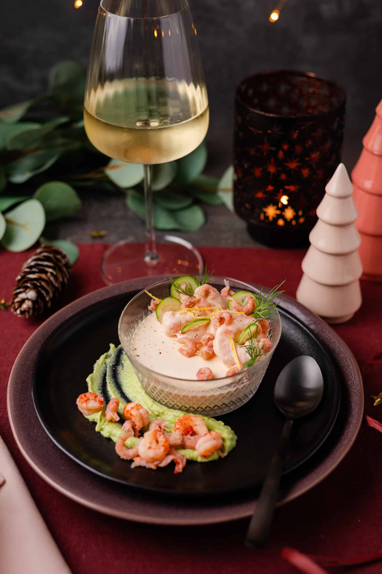 De panna cotta en garnalencocktail kun je tot een dag eerder helemaal voorbereiden en afgedekt in de koelkast zetten tot gebruik. Vlak voordat je aan tafel gaat, maak je de avocadomousse (die gaat anders verkleuren) en maak je de borden op. Ik schonk hierbij een glas Riesling.