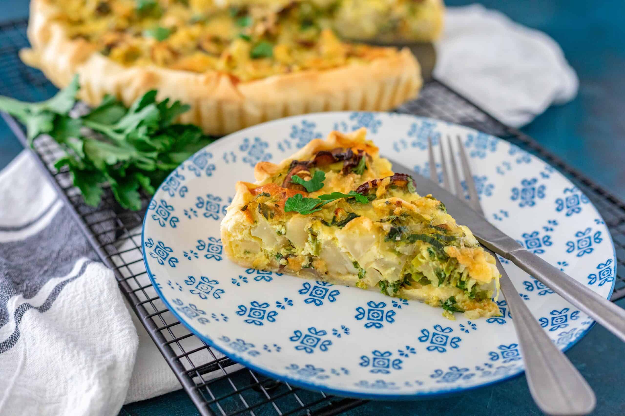 - Bak de taart 40 – 45 minuten in de voorverwarmde oven tot de randjes mooi krokant en goudbruin zijn en het midden van de hartige taart helemaal gaar is. Laat daarna afkoelen tot lauw. Garneer met een snufje zwarte peper en de overgebleven platte peterselie en snijd daarna in punten.