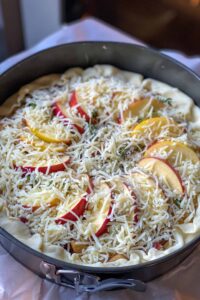 - Leg de partjes appel in een waaier in het midden van de taart en bestrooi met blaadjes tijm. Strooi daarna de Gruyère erover en sla het overtollige daag over de taart heen.
