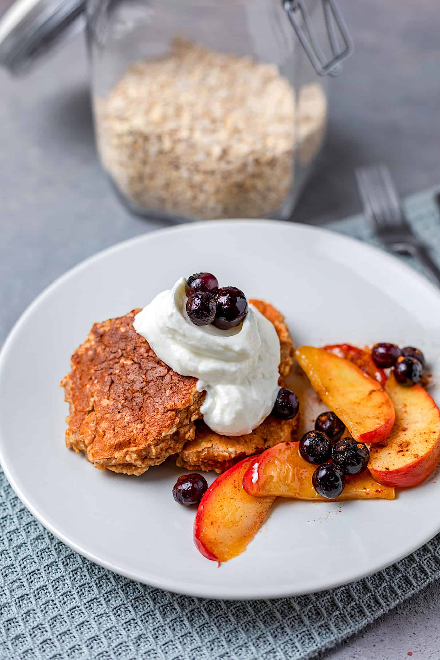 - Leg 3 havermout pancakes op een bord en garneer met een lepel yoghurt en de gebakken appeltjes met blauwe bessen. Serveer direct.