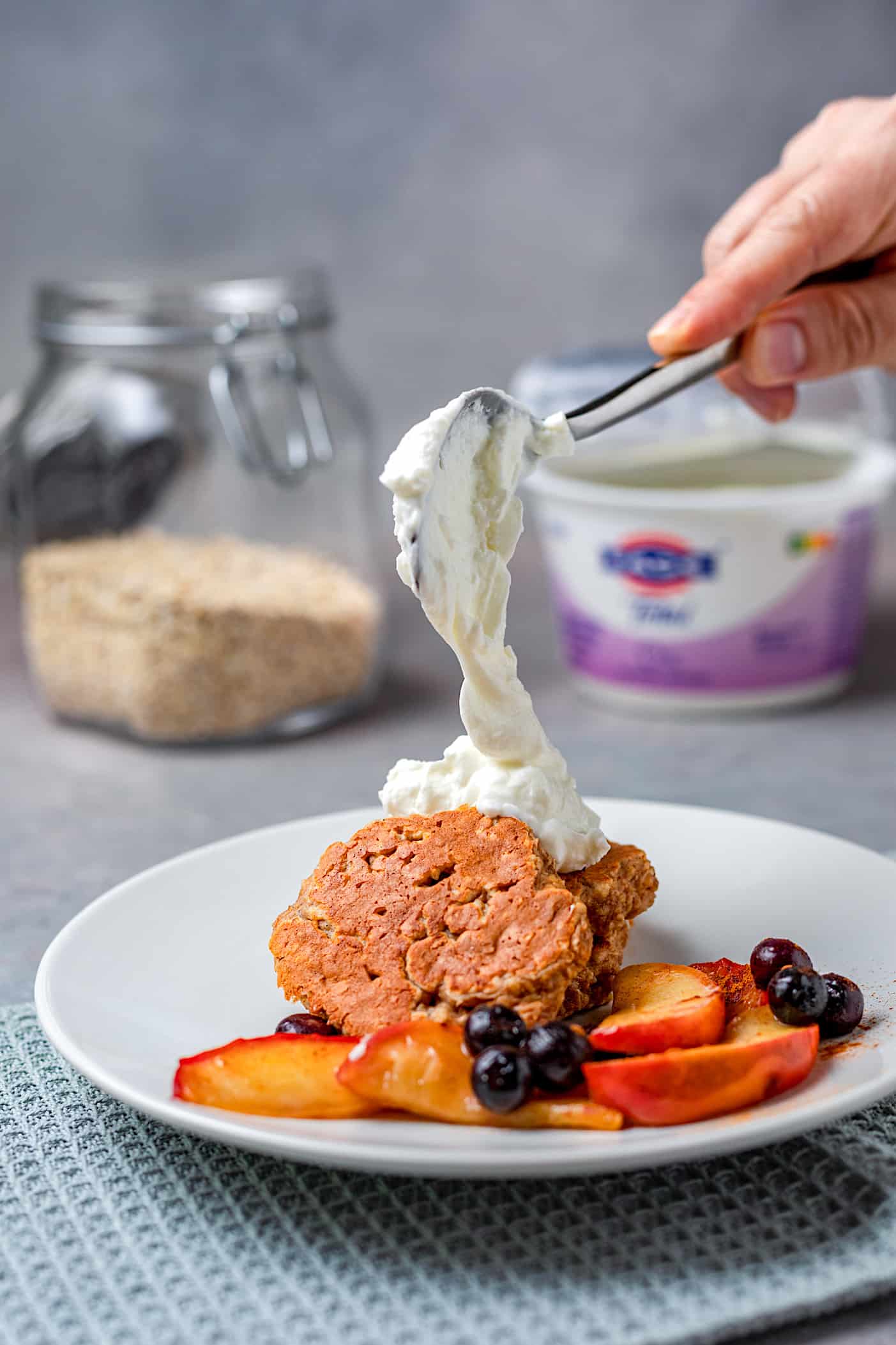 Geniet van deze lekkere havermout pancakes met yoghurt en gebakken appeltjes!
