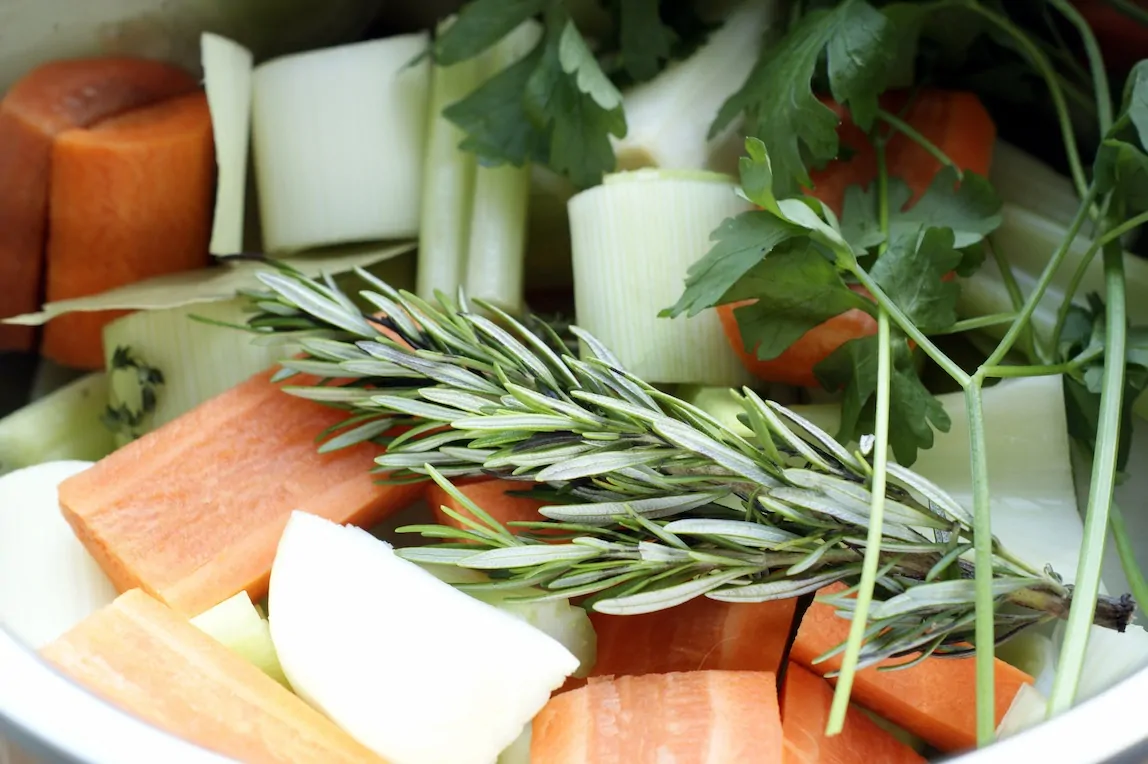 Je hebt allereerst een echt grote soeppan nodig. Snijd de bleekselderij, uien, winterpenen en preien in een paar grote stukken en doe deze in de pan. De knoflookteentjes laat je gepeld, maar worden gekneusd zodat de smaken vrij komen.