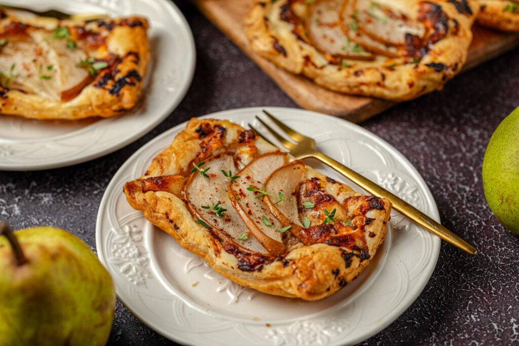 Bladerdeeghapjes met geitenkaas, speculaaskruiden en peer