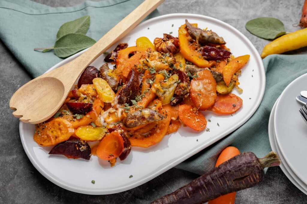 Deze ovenschotel met zoete aardappel en rozemarijn kip heb je snel in de oven staan en het is een gevarieerd recept om doordeweeks op tafel te toveren. Je varieert namelijk makkelijk in groentesoorten per seizoen en de kip kun je steeds op een andere manier kruiden. Ik koos nu voor