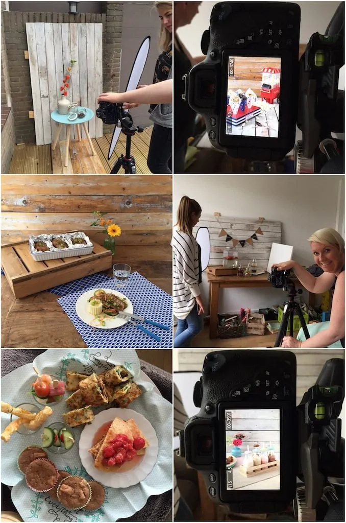 De foodfotografie wordt gedaan door mijn lieve vriendin Wendy Pronk van Deedylicious. We doen samen ook de selectie van de props en bedenken zelf de styling. Erg belangrijk vind ik het dat het eten exact zo op de foto gaat zoals het eruit ziet als ik het zelf maak in mijn keuken. Geen foodstyling of minder lang koken zodat groente er groener uitziet. Als jullie als ouders straks de recepten namaken moet het makkelijk te doen zijn en er ook realistisch uitzien. Ook hier heb ik natuurlijk wat ‘behind the scenes’ foto’s van. In 2 dagen tijd hebben we bijna 30 recepten op de foto gezet, bizar!
