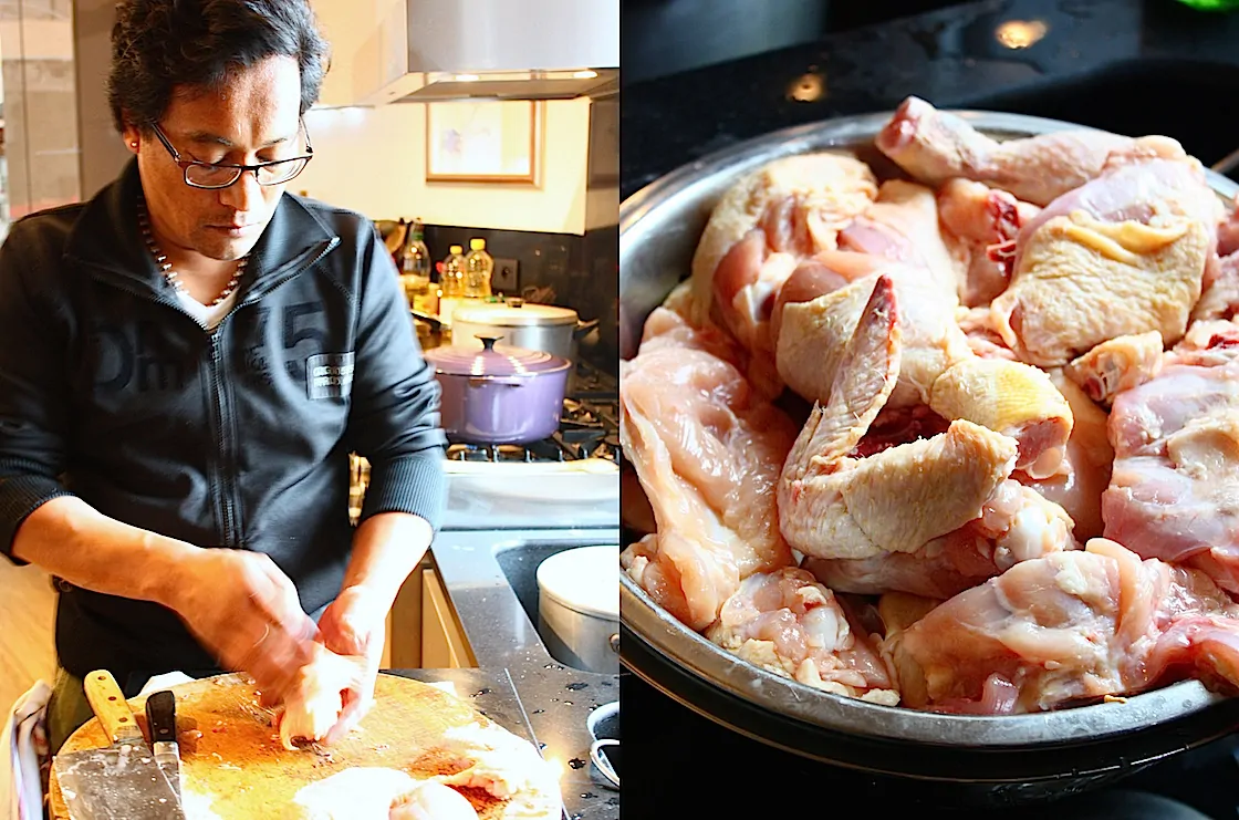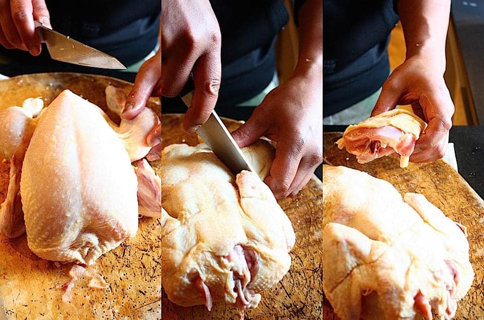 Zorg dat je een goede snijplank hebt klaarliggen en een scherp mes. Leg eventueel een vochtige vaatdoek onder de snijplank zodat deze niet kan wegschuiven. En niet geheel onbelangrijk, koop een kippetje die een goed leven heeft gehad.