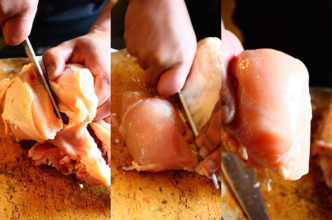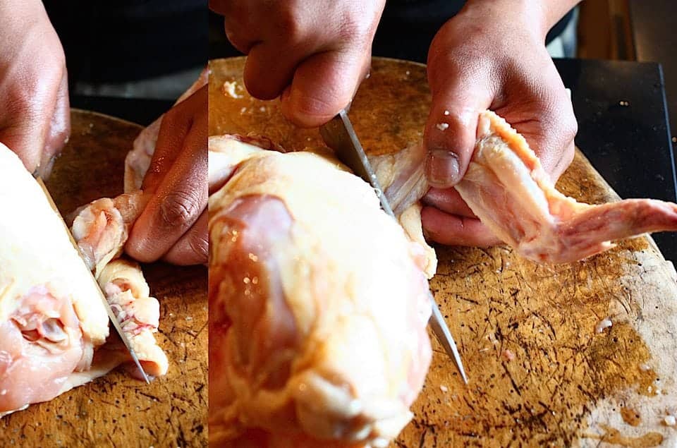 Leg de kip op zijn rug op de snijplank met de poten naar je toe gericht. Trek een poot van de kip naar de zijkant toe en snijd met het mes tussen de poot en het vel, goed langs de zijkant van de kip. Je ziet en je voelt nu het bot. Trek de poot nog meer naar de zijkant en blijf snijden totdat je op het heupgewricht komt. Je voelt op een gegeven moment dat er een zachter deel is in het bot. Hier kun je dwars doorheen snijden en zo komt de hele bout los. Herhaal dit met de andere kant.