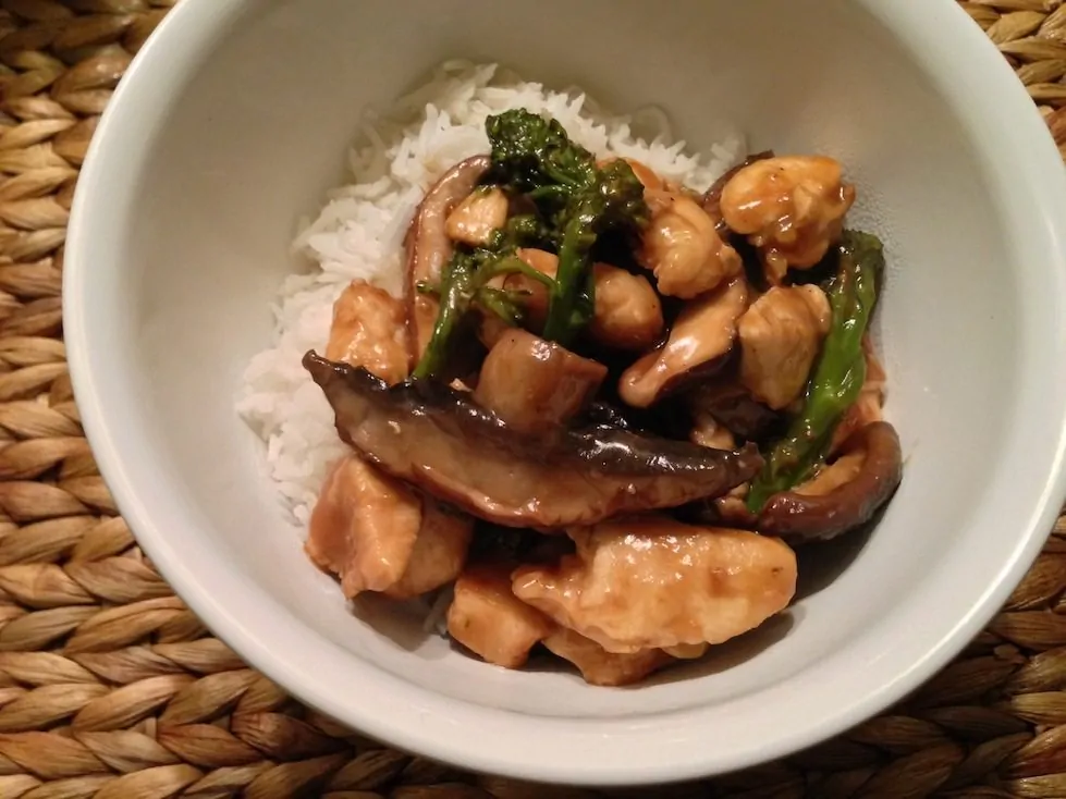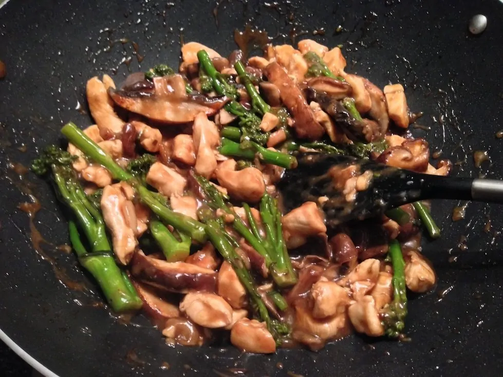 Verhit 2 eetlepels zonnebloemolie in een wok en fruit hierin kort de plakjes knoflook. Voeg daarna de kip toe en roerbak deze op hoog vuur voor een minuut. Voeg daarna de broccoli of bimi toe en roerbak deze een paar minuten mee. Als de kip een mooi bruin korstje krijgt voeg je de paddenstoelen en de saus toe. Blijf nog 2 minuten roerbakken. Je zult zien dat de saus dan ook wat dikkig begint te worden.