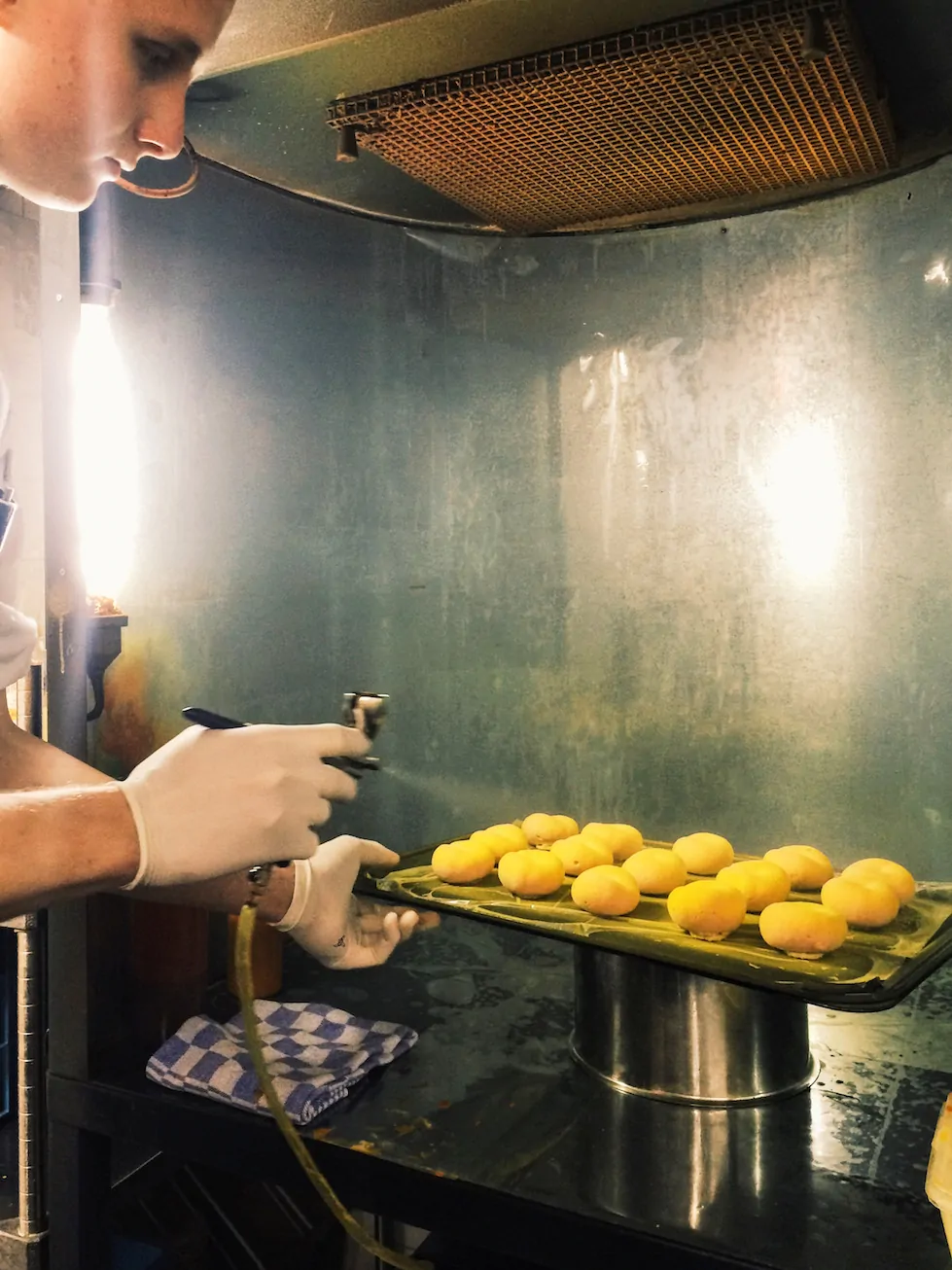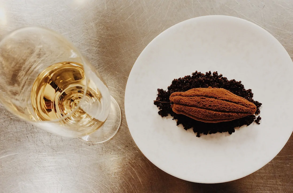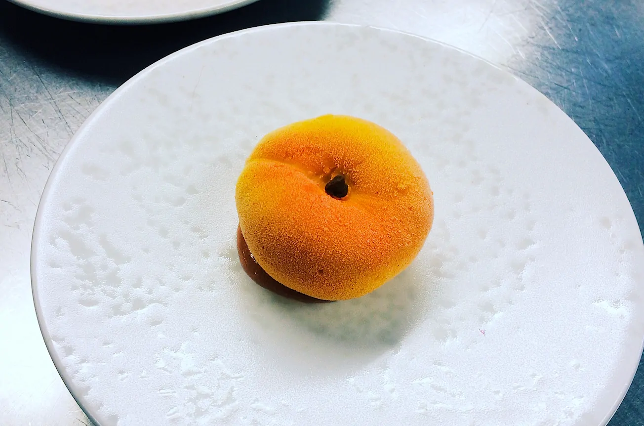 Last but definitely not least…het dessert. En zo komen we terecht in de patisserie keuken wat een kleine beleving op zich is. Vooral naar de cacaoboon met Manjari chocolade uit Madagascar ben ik erg nieuwsgierig. Maar voordat we kunnen proeven zien we de bereiding van de Pêche Melba. Wat er op het oog uit ziet als een simpele wilde perzik, is een nagebootste versie van deze vrucht en dan van sorbetijs! En als je m proeft…weer die heerlijke frisheid en lichte tonen die goed passen bij de rest van de gerechten. Een tegenhanger is de cacaoboon, waar ik eerst zo nieuwsgierig naar was, deze is erg aanwezig en sterk van smaak. Máár als je nu eerst een hapje neemt van de Pêche Melba en daarna van de cacaoboon: heaven on earth.