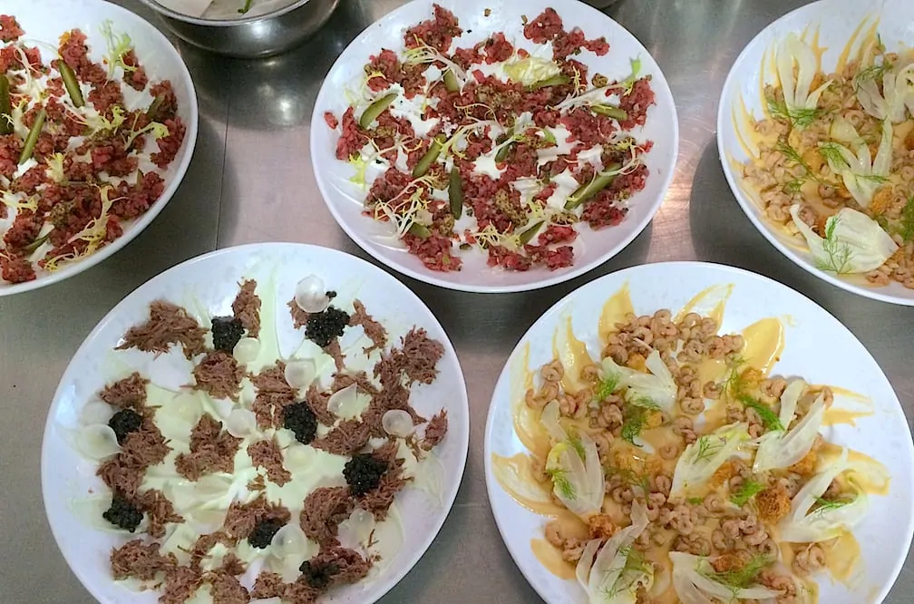 Alle voorgerechten worden in het midden van de tafel geserveerd, zodat wij deze kunnen proeven. Wat een straf zeg! Mooi niet, het water loopt mij in de mond bij het zien van de verfijnde gerechten. Licht qua uitstraling en opmaak: check! Ik heb alle voorgerechten opgeschept en deze waren inderdaad stuk voor stuk vol van smaak. Mijn favoriet is de uit elkaar getrokken steak tartaar (zoals omschreven door de gastheer) met een frisse room en crumble van aardappel & knolselderij. Aan tafel wordt hier nog de geschaafde eendenlever aan toegevoegd. Jam!