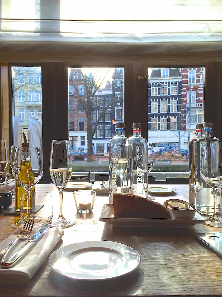 Voordat ik in ga op het culinaire gedeelte, wat een geweldige plek! Midden in het centrum van Amsterdam, met een uitzicht op de Amstel en een super lichtinval door de grote ramen. Als de zon schijnt, straalt deze sowieso naar binnen. Aldus een vriendelijke ober. We zitten aan de chef’s table en hebben een mooi uitzicht op de keuken. Later kom ik erachter dat er maar liefst zeven keukens in het pand aanwezig zijn. Voor ieder onderdeel een, we namen onder andere een kijkje in de patisserie keuken maar daarvoor nog even geduld, deze komt aan bod bij het dessert van dit verhaal.