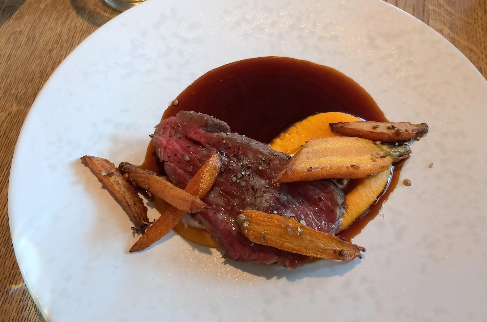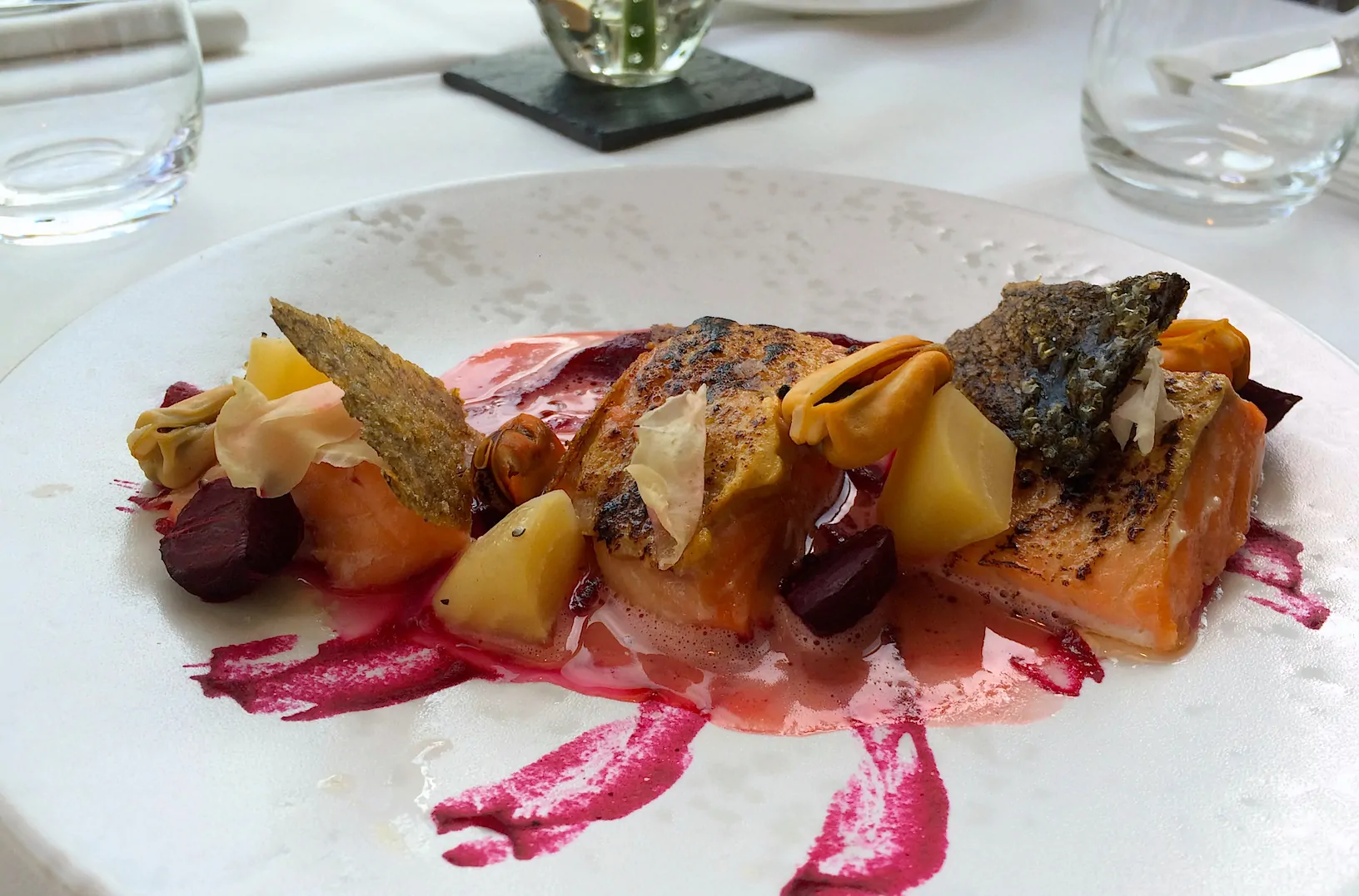 Op de menukaart lijkt de omschrijving van de gerechten vrij simpel. En om ons te bewijzen van het tegendeel krijgen we wederom alle gerechten op tafel. De uitblinker, zowel qua uitstraling als smaak, is wat mij betreft de gepocheerde zalm met mosselen en confit van biet. Heel verrassend met veel verschillende smaken, maar toch een licht gerecht.
