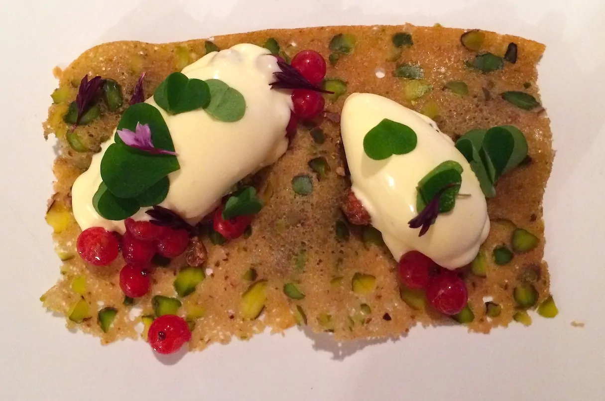 Gelukkig was Kjartan nog niet klaar, want hij ging vrolijk door met verbazen tijdens het dessert. De flinterdunne pistache cake (weer een uitdaging voor thuis) met rode bessen en citroen-tijm ijs was de perfecte afsluiter van een prachtige avond.