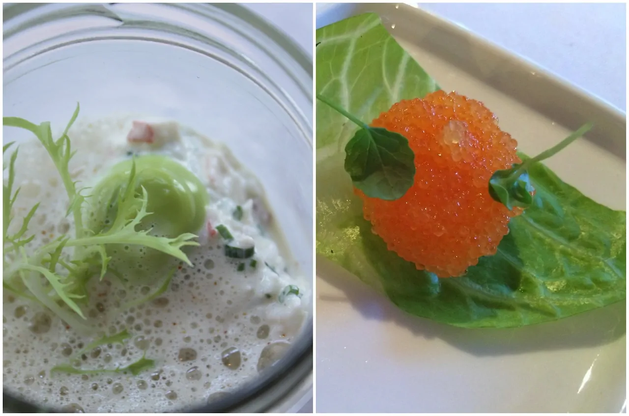 We begonnen met 2 amuses. Een van de beste krabsalades die ik ooit heb gegeten met mossel en cress en een slaatje met Zweedse kaviaar en sour cream.
