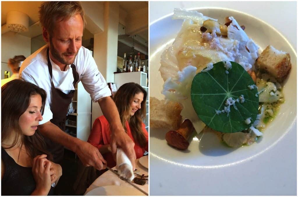 Als voorgerecht kregen we een stukje gebakken leng (zoutwatervis, familie van de kabeljauw) met bereidingen van bloemkool, gestoomde mosselen en geraspte bevroren paling. Die Kjartan zelf even kwam raspen.