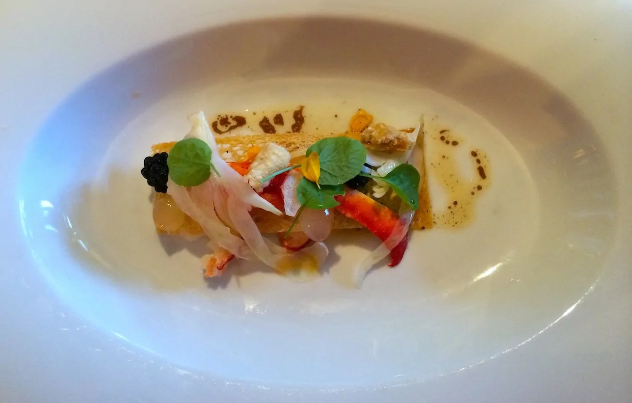 De kreeft op ‘melba’ toast met venkel, beluga kaviaar, vinaigrette van kreeft en avocado mayonaise was wederom fantastisch. Vooral met de Riesling erbij.