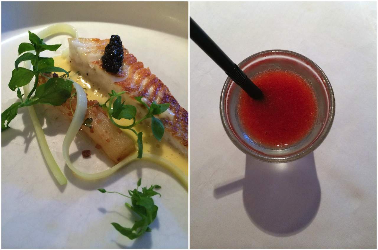 Op naar het volgende gerecht, gebakken tarbot met carelian kaviaar, gerookte tarbot en krokante lardo. Toch een puntje van kritiek, bij dit gerecht hadden we de kaviaar-grens toch wel bereikt. En de carelian kaviaar was te overheersend waardoor de tarbot teveel naar de achtergrond verdween. Met de strawberry slush die daarna kwam, konden we even goed neutraliseren.