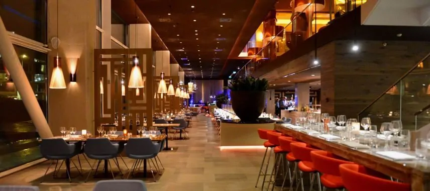 Aan de andere kant kijk je uit op de 1e verdieping (straatniveau) waar de ingang is van het Room Mate Aitana Hotel. Officieel geen familie van elkaar, maar wel zo verbouwd dat het hotel en I-Dock vloeiend in elkaar overlopen. Hotelgasten eten en drinken ook in I-Dock waardoor je een heel internationaal publiek krijgt zonder dat je het gevoel hebt dat je in een hotelbar zit. Het ziet er allemaal prachtig uit bij I-Dock, maar ik vond het ook immens waardoor je het gevoel van intimiteit kwijt bent. Alhoewel we aan tafel dat minder hadden doordat het licht zo is ingericht dat het meer sfeer brengt. Voor een avondje romantisch dineren zou ik niet naar I-Dock gaan, wel voor een gezellige avond met vrienden.