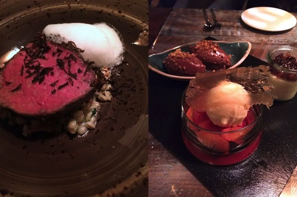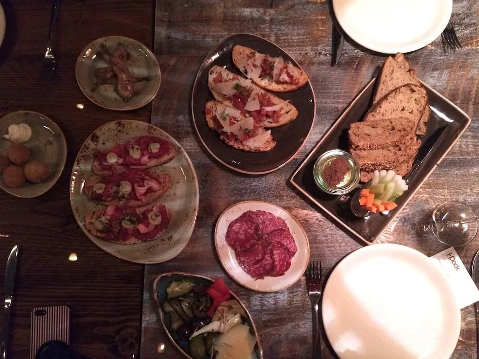 We starten het diner met een tafel vol antipasti, de ‘snacks to share’. Met gemarineerde groenten, gerookte rib-eye op crostini’s, zelfgemaakte groente bitterballen met geitenyoghurt hangop, olijven en gekonfijte kwartel met honing en mint. De kwartel was hemels lekker en ik werd ook heel gelukkig van de rib-eye. De rest van de hapjes waren verder niet heel uitgesproken, maar wel lekker en goed op smaak.