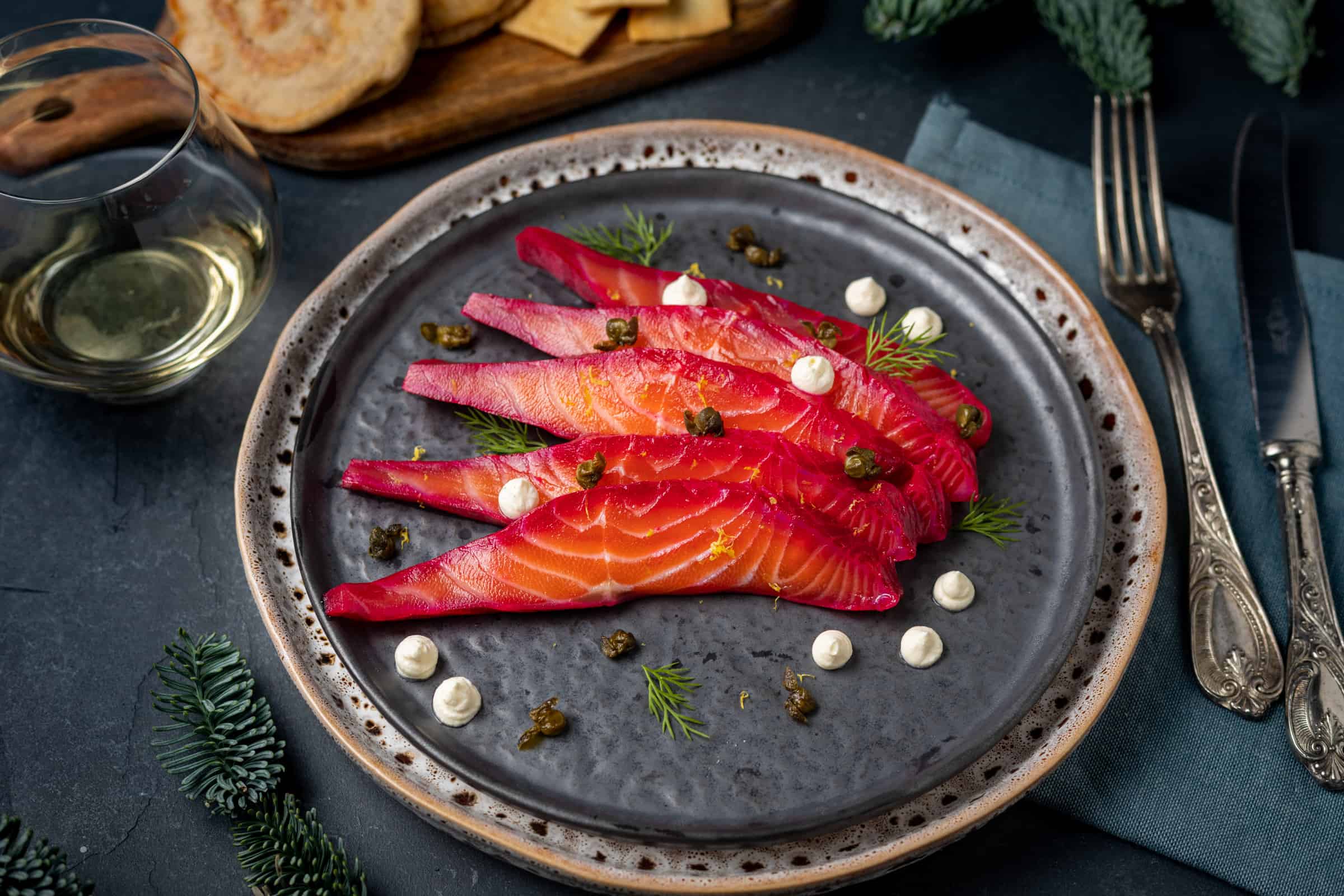 - Plaats de plakjes gemarineerde zalm op een bord en garneer met stipjes citroencrème, de gefrituurde kappertjes en wat kleine takjes dille. Serveer deze met de blini’s en/of krokante toastjes.