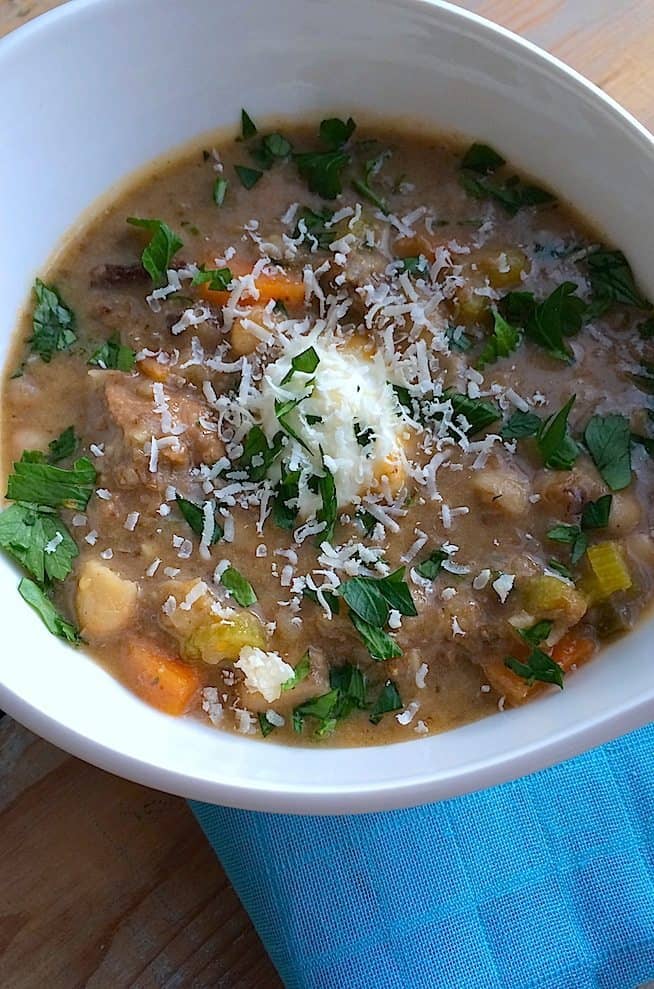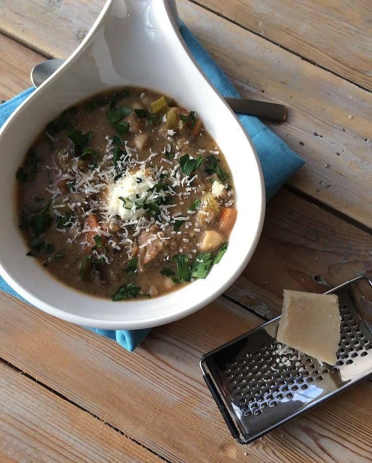 Heerlijk, zo’n grote kom soep vol met verse groenten. In de winter heb ik het liefste iedere dag een pan soep op het vuur staan pruttelen. Maar ja, dan zou Francesca Kookt! een ‘soeprecepten’ blog worden, dus laten we dat maar niet doen. De komende maanden gaan we wel weer meer soepen eten dus echte soepliefhebbers komen aan hun trekken. Deze Italiaanse bonensoep is ultiem comfort food. Vooral ook door de toevoeging van de worstjes, sour cream en Parmezaanse kaas. Wil je ‘m vegetarisch hebben? Laat dan de worstjes eruit en vervang de runderbouillon door groente- of bospaddenstoelenbouillon.