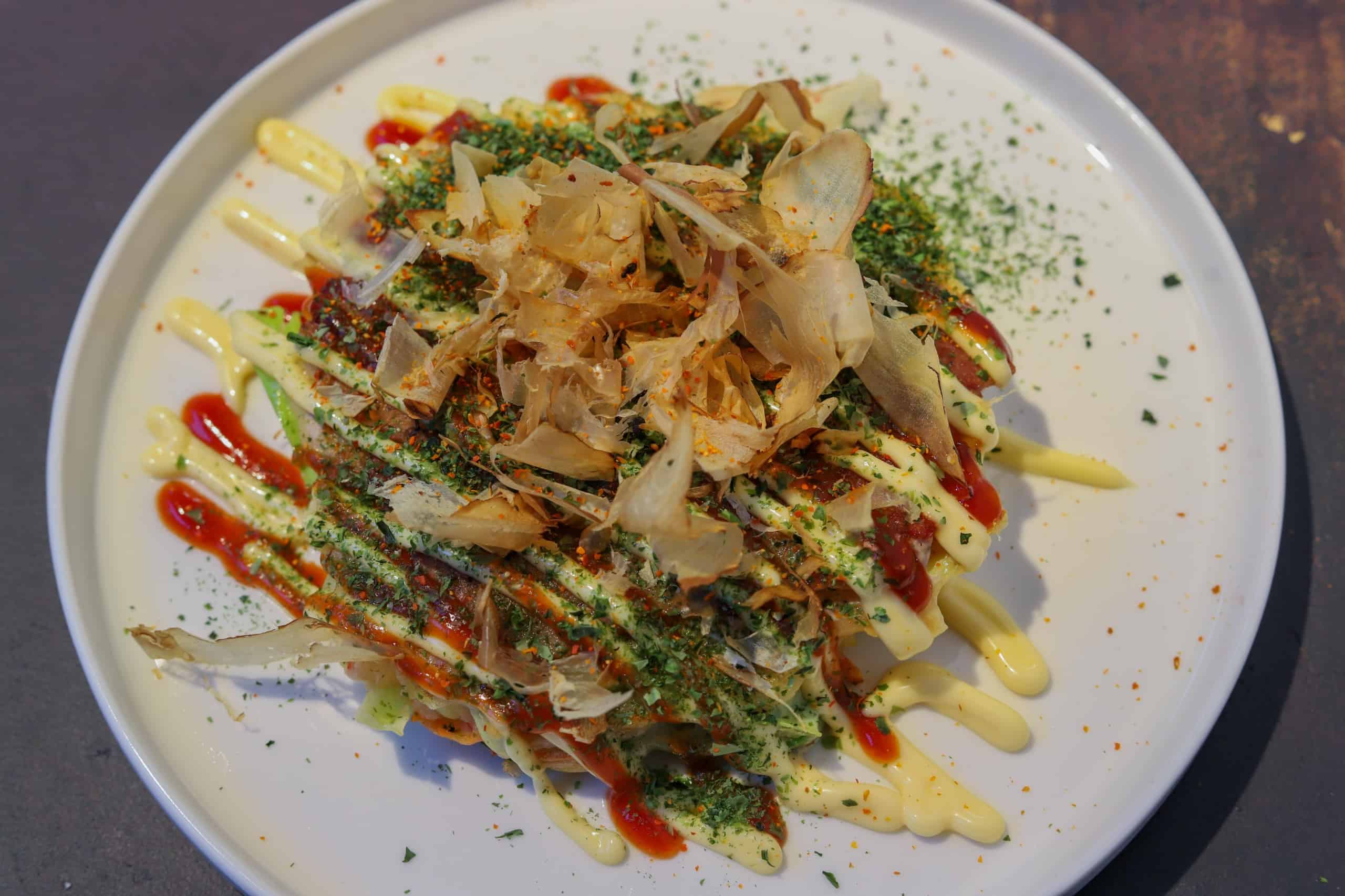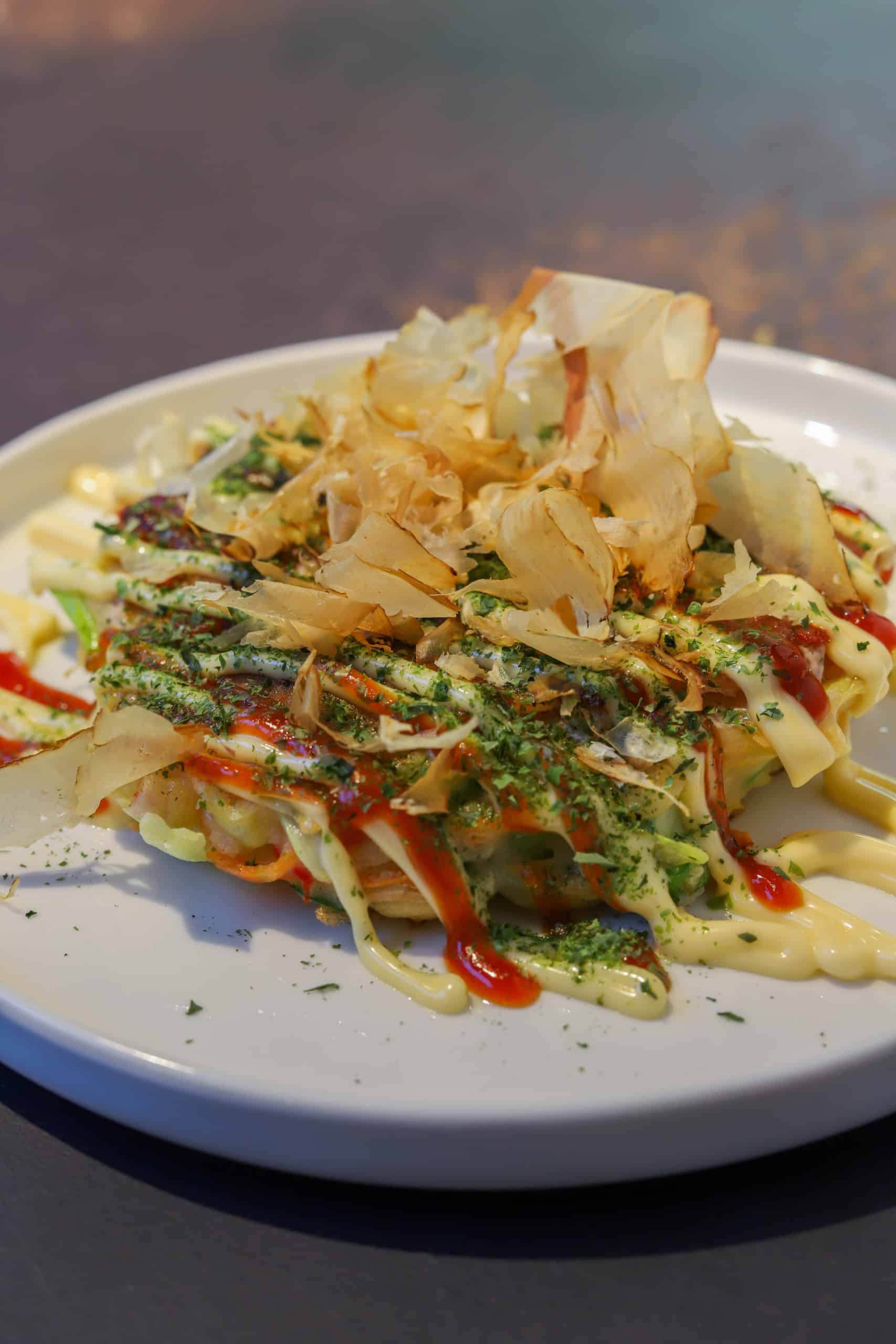 - Garneer de okonomiyaki met streepjes van je zelfgemaakte okonomiyakisaus (helpt als je het overschept in een spuitzak of spuitflesje, streepjes kewpie mayonaise en top af met aonori, bonitovlokken (laat weg voor vega) en optioneel gedroogde sriracha peper of chili flakes.