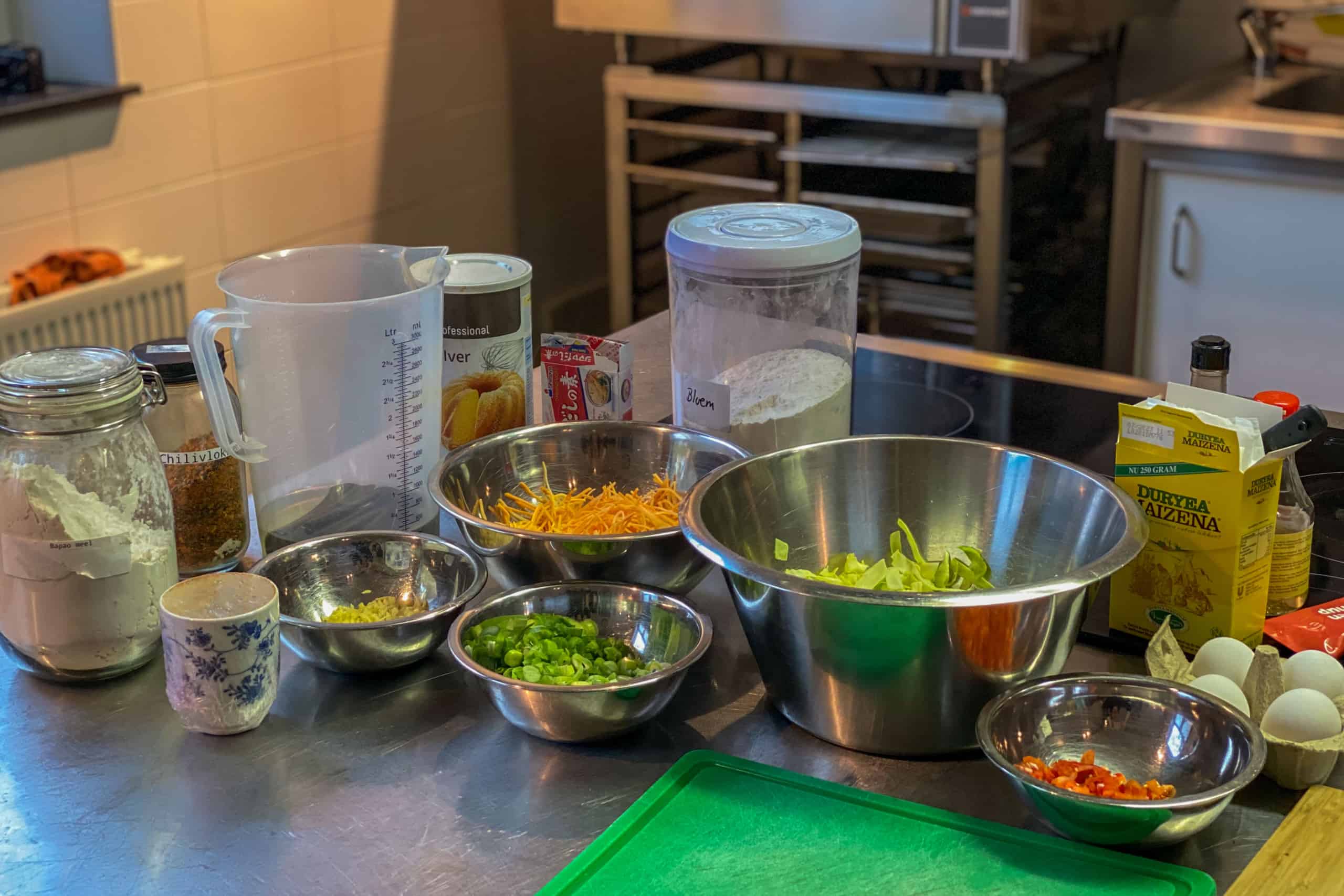 - Meng het groentenmengsel door het beslag en mix de eieren erdoor. Alle groenten moeten goed door het beslag heen gemixt zijn. Het wordt een wat dikker beslag, dat klopt.