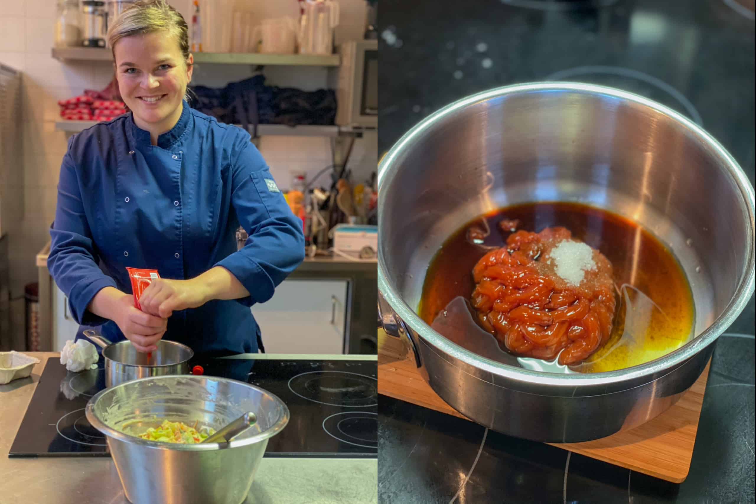- Doe alle ingrediënten voor de saus in een steelpannetje, roer door elkaar en breng aan de kook. Draai het vuur terug en laat 3 minuten zachtjes pruttelen. Daarna is de saus klaar en laat je ‘m afkoelen. Niet te lang door laten koken, want de saus kan nog wat indikken tijdens het afkoelen.