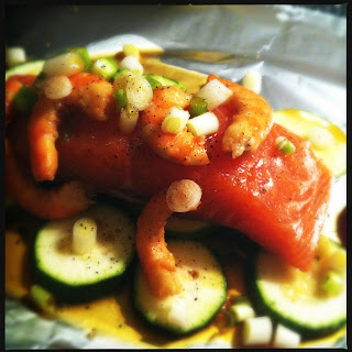 Neem 2 grote stukken aluminiumfolie. Leg op een stuk folie de helft van de plakjes courgette, strooi hier wat geraspte gember over. Leg hierop een zalmmoot en de helft van de gamba’s. Strooi hier wat zwarte peper over en ongeveer 3 lepels van de marinade. Als laatste strooi je wat van de bosui over de vis.