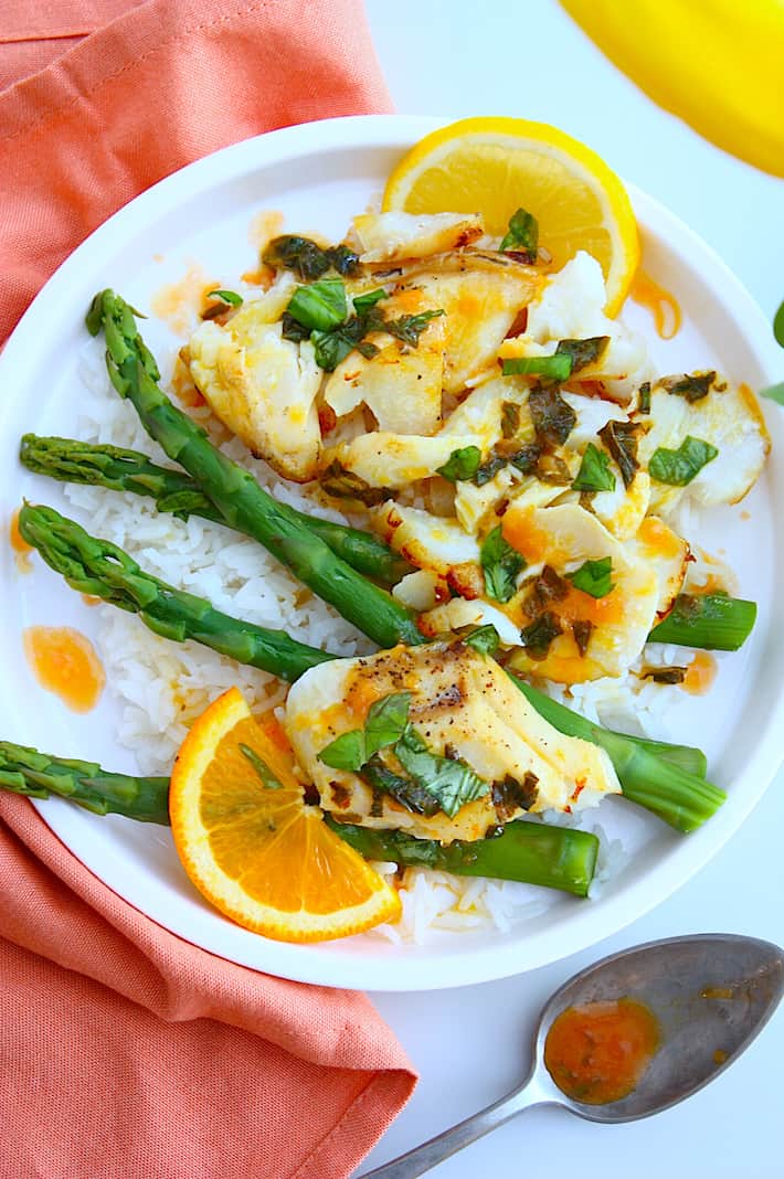 - Maak de borden op met rijst, asperges, kabeljauw en schenk er, naar smaak, wat van van de citrus basilicumsaus over. Serveer direct.