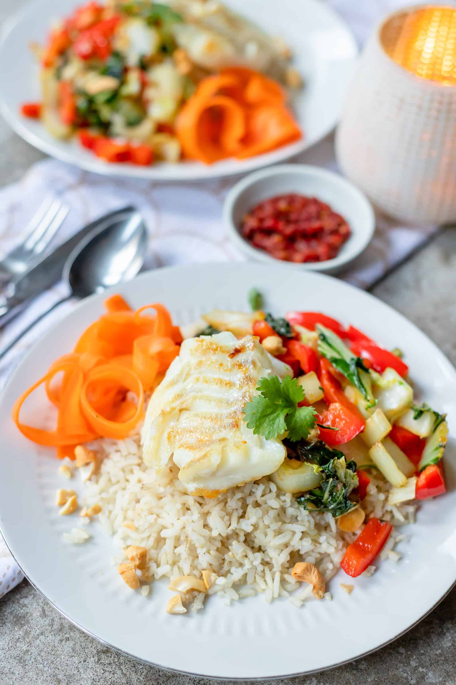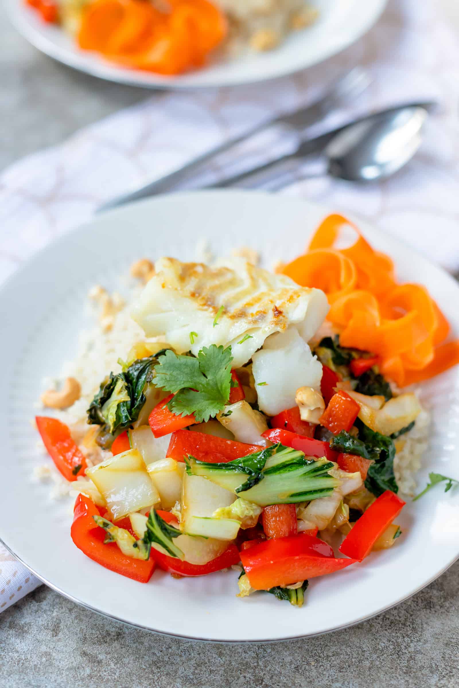 Dit kleurrijke bordje ziet er niet alleen prachtig uit, maar is ook nog eens superlekker! Voor deze kabeljauw met wokgroenten heb ik de groenten gecombineerd met koriander en de cashewnoten en zachte kabeljauw maken het helemaal af. Het zoetzuur van wortel is een lekker frisse aanvulling.