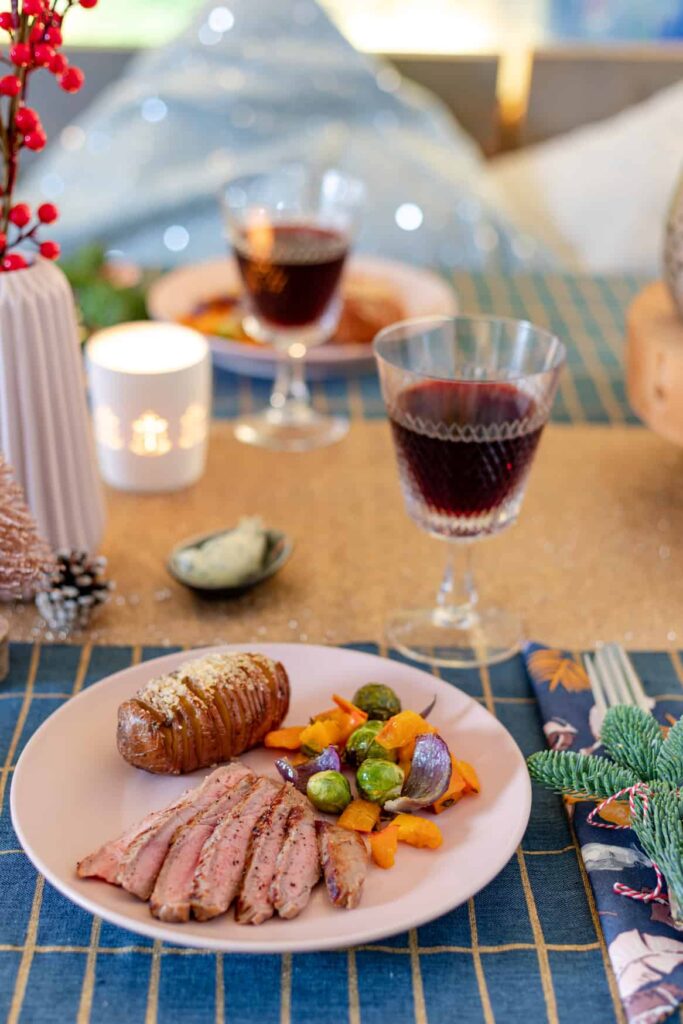 Bij de kalfsentrecote serveerde ik hassalback aardappelen uit de oven met Parmezaanse kaas, geroosterde groenten en een zelfgemaakte kruidenboter waar alle overgebleven kruiden uit de andere gangen in waren verwerkt. Die kruidenboter smaakt echt fantastisch bij het vlees! En ook ik maak het mezelf graag wat makkelijker tijdens het hoofdgerecht en daarom gebruikte ik een kant-en-klare groentenmix voor in de oven waarin spruitjes, pompoen en rode ui waren gemengd. Hartstikke handig, die kon zo de oven samen met de hasselbacks terwijl we aan het tussengerecht zaten.