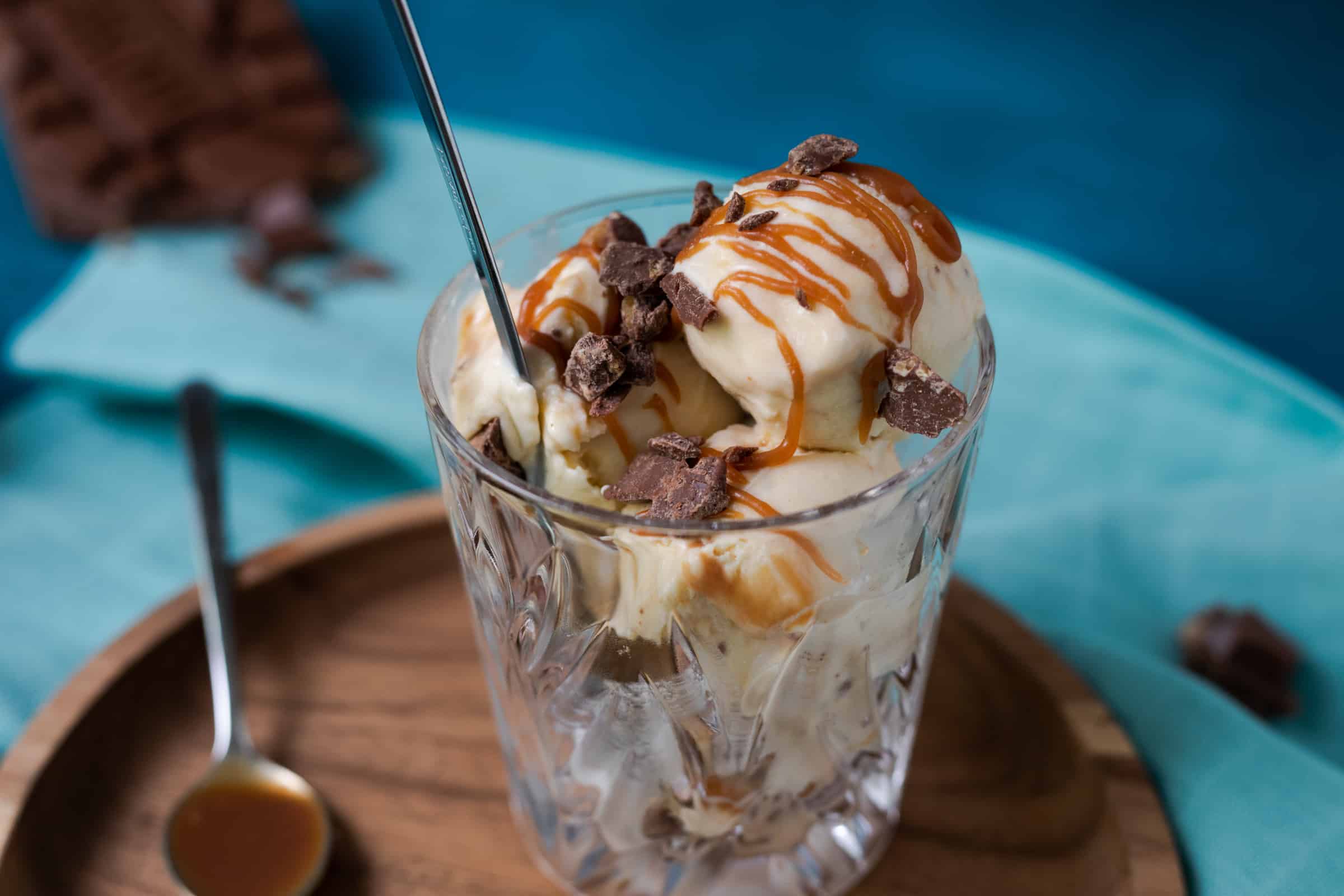 - Voor het samenstellen schep je een paar bollen ijs in een glas. Schenk wat extra gezouten karamelsaus over het ijs en bestrooi met gehakte chocolade.