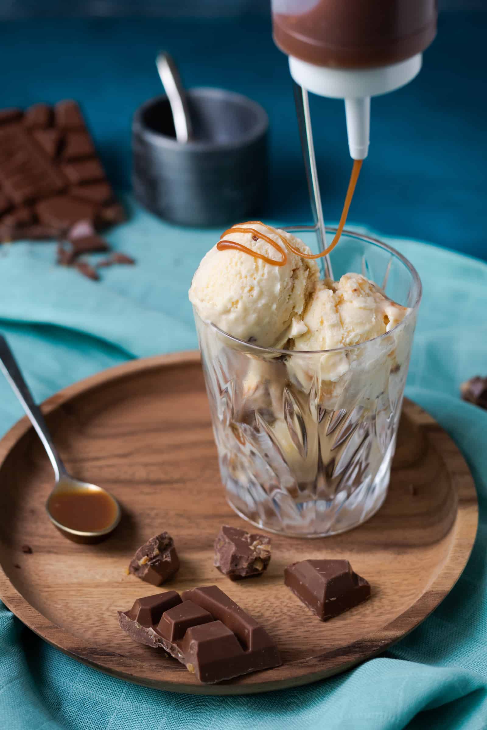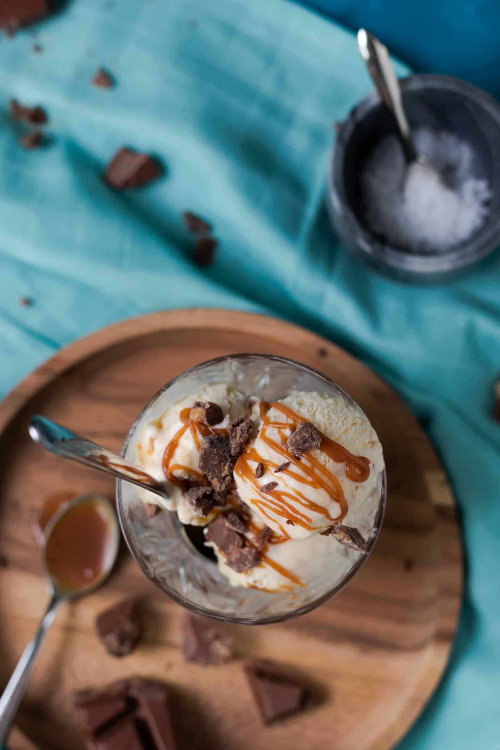 Voor het karamel zeezout roomijs is het basisrecept van Rutger Bakt gebruikt en daar is een reep Tony’s Chocolonely Karamel Zeezout aan toegevoegd. Ja, een hele reep! Daarbij maakte ze zelf een karamelsaus met een snufje zeezout die door het ijs gaat, maar die je er ook rijkelijk overheen kunt schenken tijdens het serveren. En dat maakt dit karamel zeezout roomijs echt helemaal af.