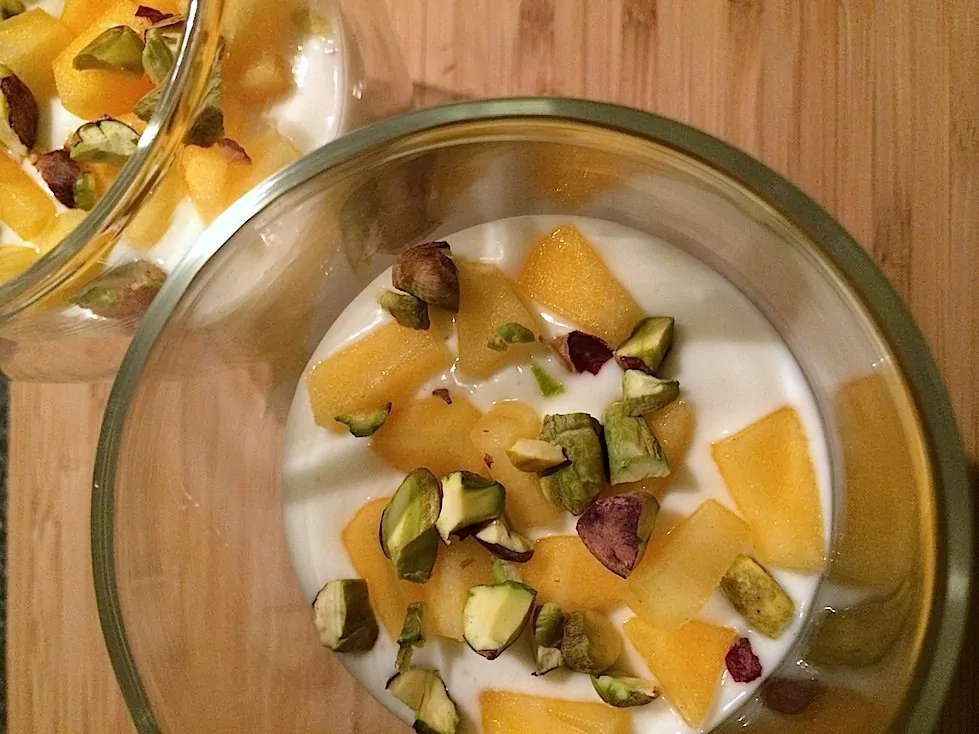 Als de melk is afgekoeld, roer je deze door de kwark samen met de saffraan (en het beetje water). Meng dit goed door. Schil de kaki en snijd deze in kleine stukjes. Neem 4 kommetjes of glazen en vul deze met het kwarkmengsel. Garneer met blokjes kaki en de gehakte pistachenoten.