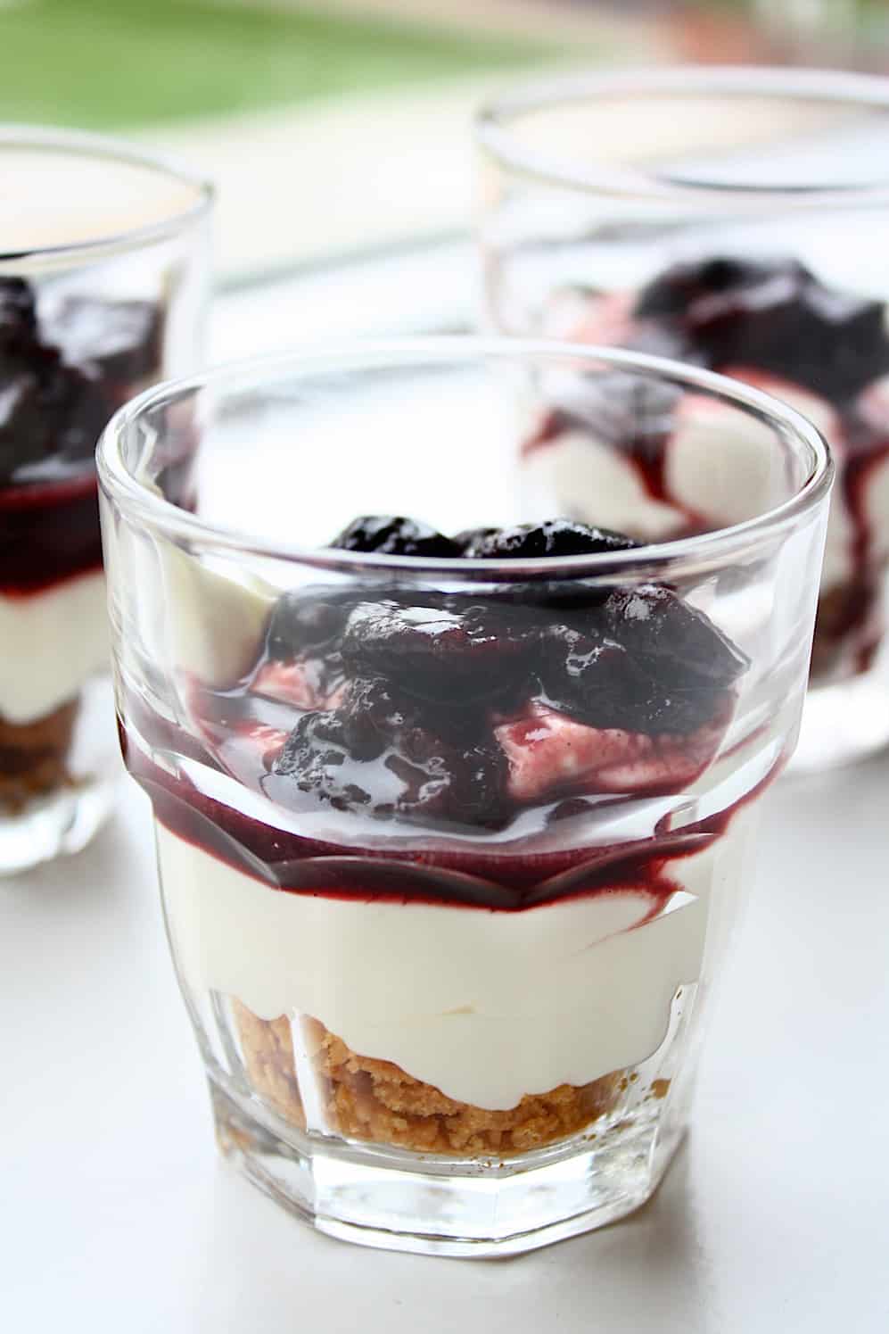 Roer in een kom de roomkaas, Griekse yoghurt, poedersuiker en sinaasappelsap door elkaar totdat je een romig mengsel hebt. Verdeel dit over de 6 glaasjes met een lepel of gebruik er een spuitzak voor. Schep daarna nog wat van de kersen compote ‘on top’.