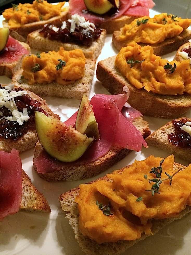 Bij onze kerstcocktail met mandarijn en rozemarijn wilden we een lekker hapje serveren. Dat werden er uiteindelijk drie, omdat we niet konden kiezen. Maar dat was geen foute keuze, want de kerst bruschetta’s smaakten naar meer! We serveerden 3 soorten, met gekarameliseerde rode ui, pompoen-knoflookspread en de werkelijk waar onovertroffen bruschetta met dungesneden gerookte entrecote, vijgen en balsamico azijn met witte truffel. De laatste bruschetta wordt wat lastig om na te maken, omdat je daar hele specifieke ingredienten voor nodig hebt. Maar ik heb het recept iets versimpeld, waardoor er nog steeds een overheerlijke variant van kan worden gemaakt.