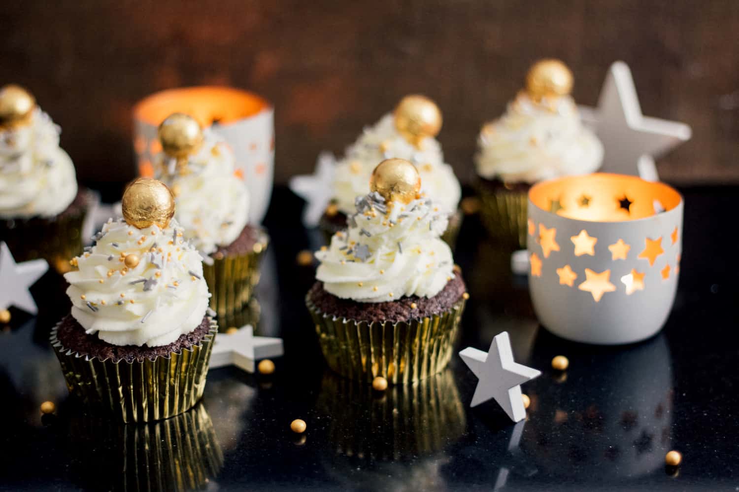 Voor deze feestelijke brownie cupcakes gebruikte ik de Dr. Oetker Glamour Mix en Dr. Oetker Chocofantasie die je in de supermarkt kunt kopen. De chocolade kerstbal ‘on top’ komt bij Xenos vandaan. De gouden cupcakevormpjes had ik nog in de kast liggen, maar in de kerstperiode vind je genoeg vormpjes in kerstthema bij (bak)winkels. Ook handig: zorg dat je spuitzakken met spuitmondjes in huis hebt waar je mooie toeven mascarpone- of slagroom mee kunt maken. Dat is de basis van je decoratie en dat krijg je alleen goed met een spuitzak.