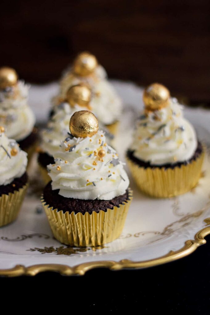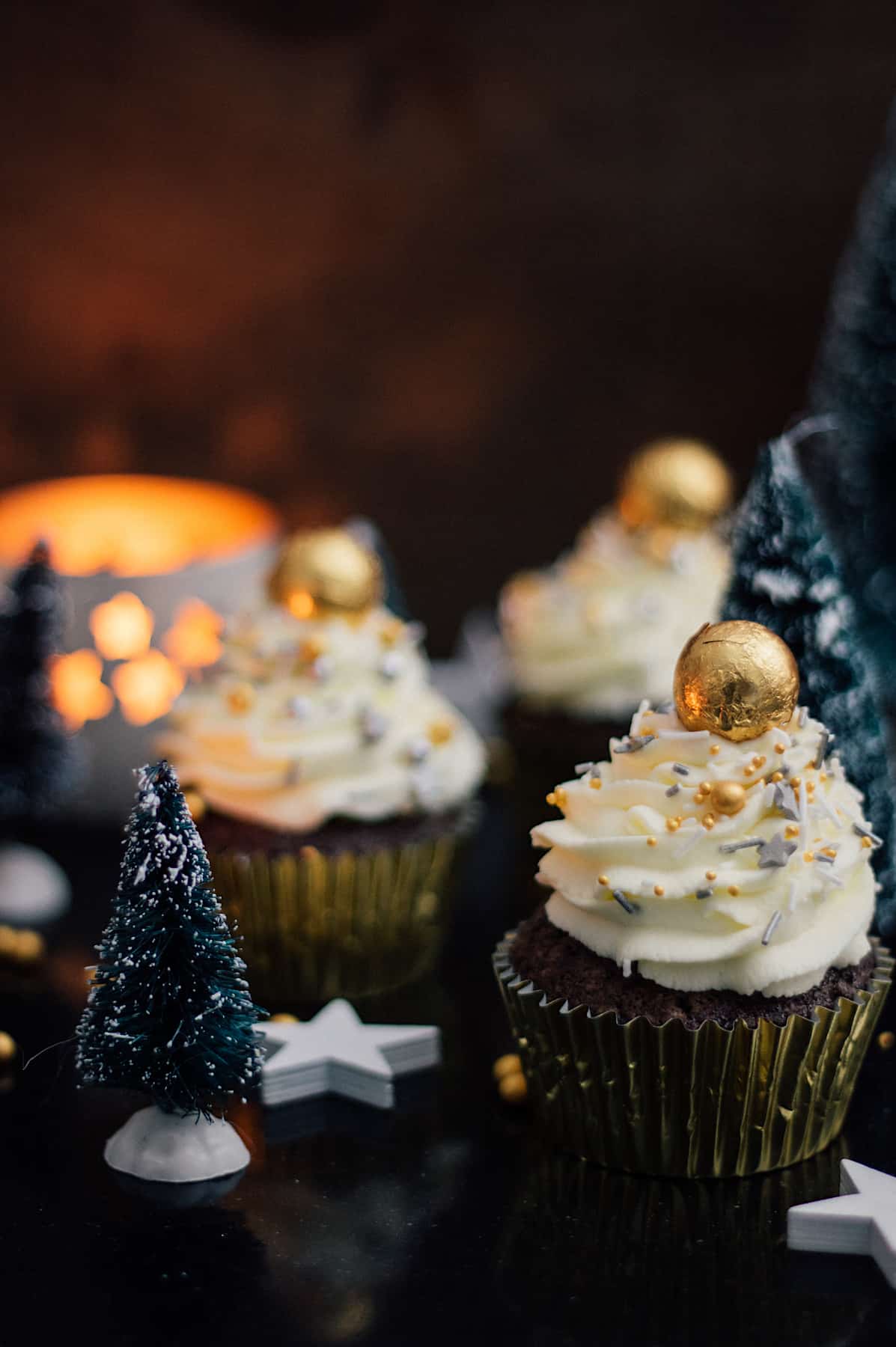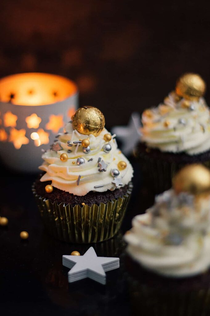 Voor deze feestelijke brownie cupcakes gebruikte ik de Dr. Oetker Glamour Mix en Dr. Oetker Chocofantasie die je in de supermarkt kunt kopen. De chocolade kerstbal ‘on top’ komt bij Xenos vandaan. De gouden cupcakevormpjes had ik nog in de kast liggen, maar in de kerstperiode vind je genoeg vormpjes in kerstthema bij (bak)winkels. Ook handig: zorg dat je spuitzakken met spuitmondjes in huis hebt waar je mooie toeven mascarpone- of slagroom mee kunt maken. Dat is de basis van je decoratie en dat krijg je alleen goed met een spuitzak.
