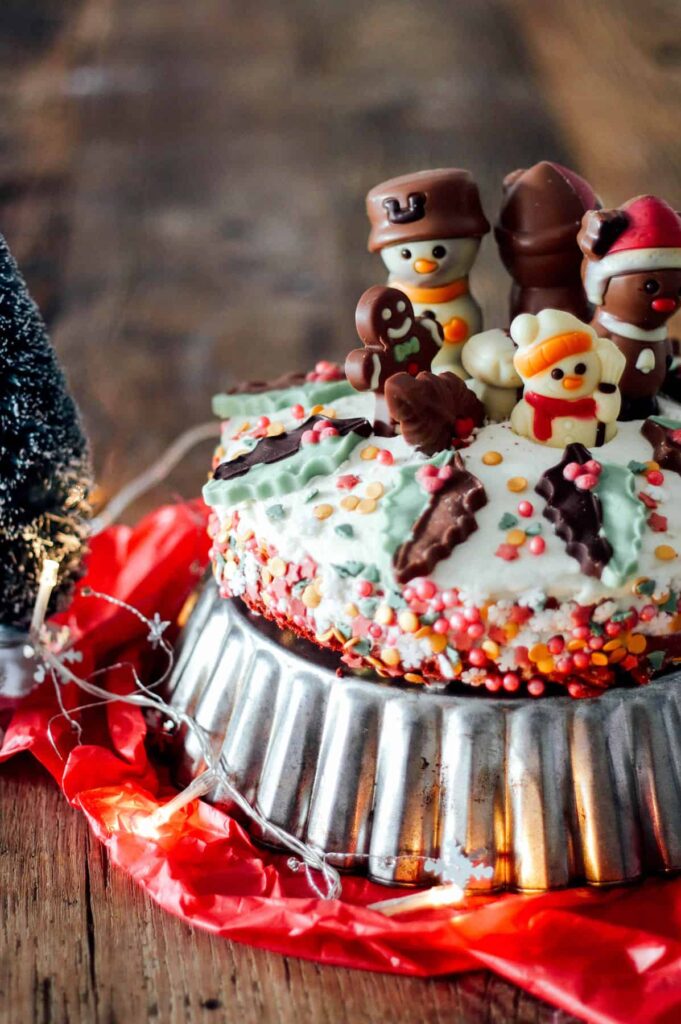 - Druk met je vlakke hand sprinkles tegen de zijkant van de cake aan en decoreer de bovenkant met chocolade hulstblaadjes, chocolade kerstfiguren en nog meer sprinkles.