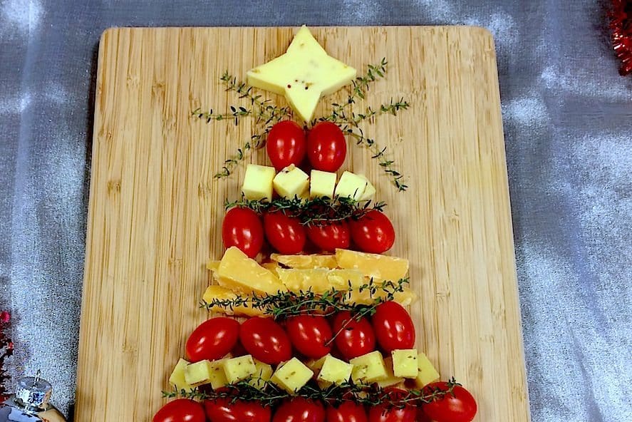 Zoek een plank of platte schaal uit waar je straks je kerstboom op gaat maken. Snijd je kazen in hapklare blokjes. De echte oude kaas kun je ook brokkelen. Maak een ‘stam’ van een van de kaassoorten en snijd een ster uit die je als ‘piek’ gebruikt.