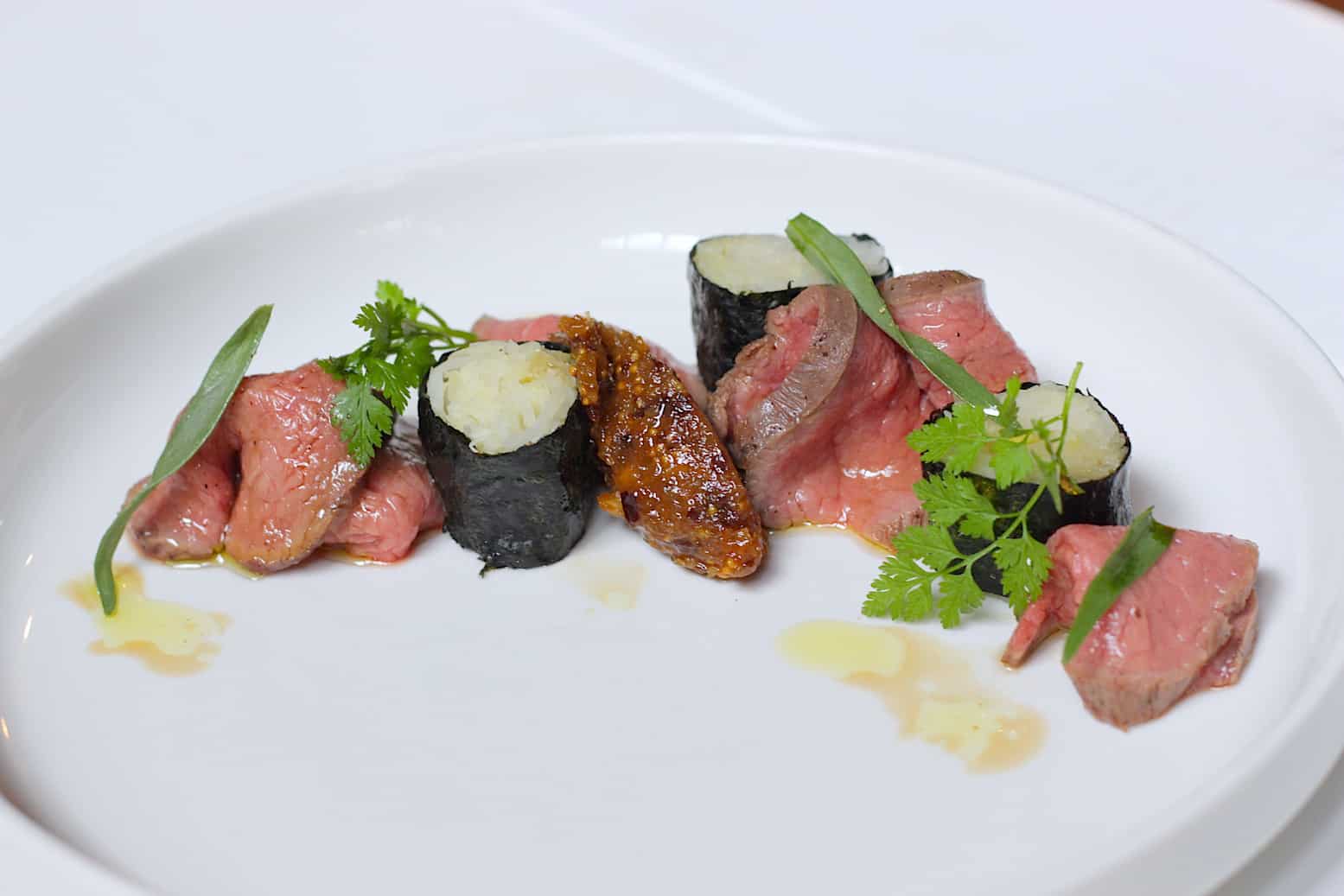 - Serveer je het als voorgerecht? Maak het bord dan op met 4 plakjes hertenbiefstuk, 3 rolletjes sushi, 2 lepeltjes (canelletjes) van de tutti frutti compote en garneer met wat blaadjes kervel en dragon.