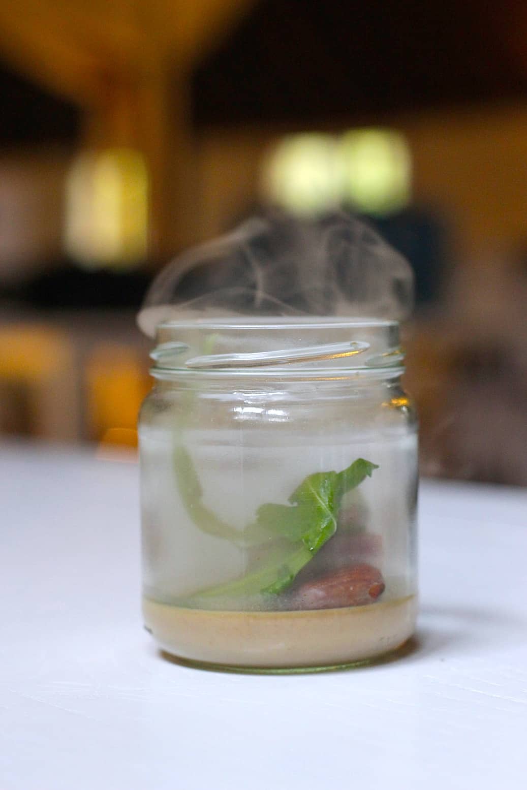 - Serveer je het als hapje in het potje (zoals in het filmpje)? Doe dan 1 stukje tonijn daarbij, wat gerookte amandelen, blaadje rucola en een paar druppeltje balsamico. En mocht je nou heel toevallig een rookmachine thuis hebben staan, voeg je ook nog wat rook in het potje toe.