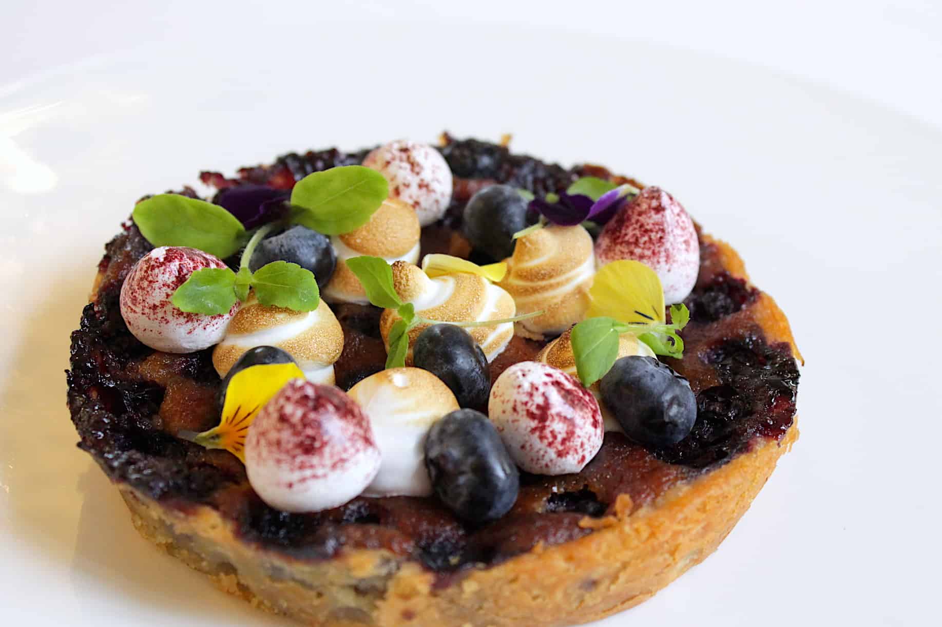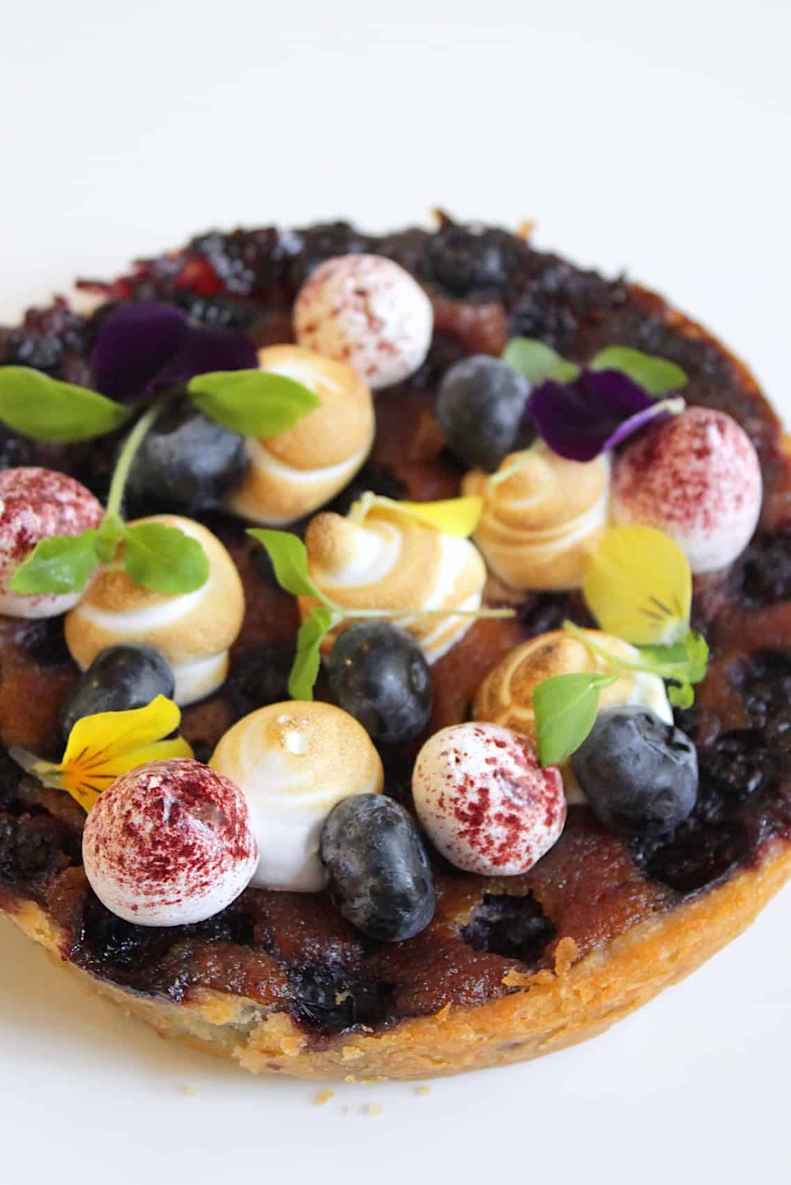 - Garneer het taartje verder met de schuimpjes (optioneel), verse blauwe bessen, eetbare viooltjes en honing cress.