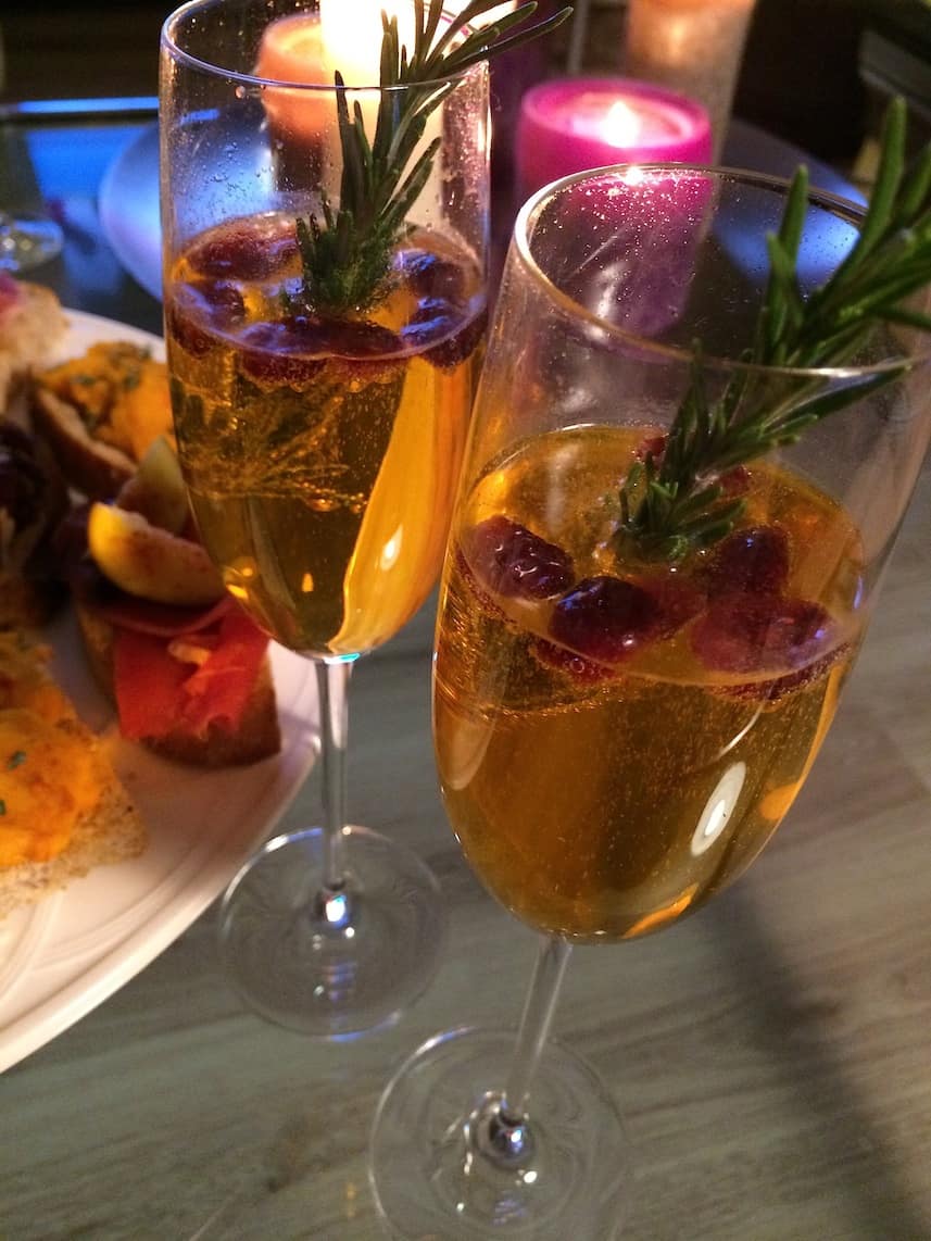 Schenk een scheutje mandarijnenlikeur in 4 champagneglazen of andere feeestelijke glazen. Vul deze bij met Moscato d’Asti. Doe in ieder glas een takje rozemarijn en 5 cranberries. Serveer direct en geniet van de combinatie van zoet, licht zuurtje en het kruidige van de rozemarijn in 1 glas!