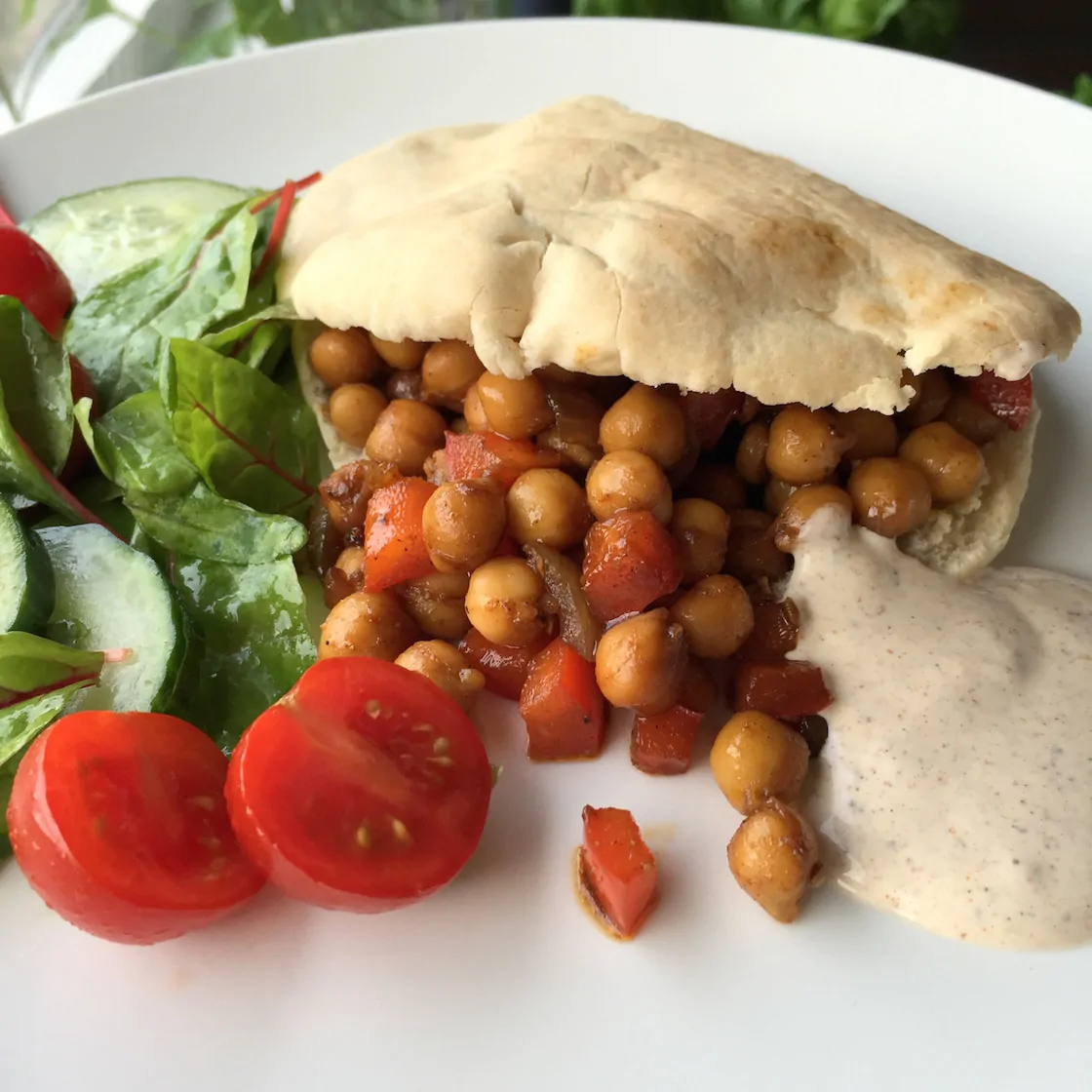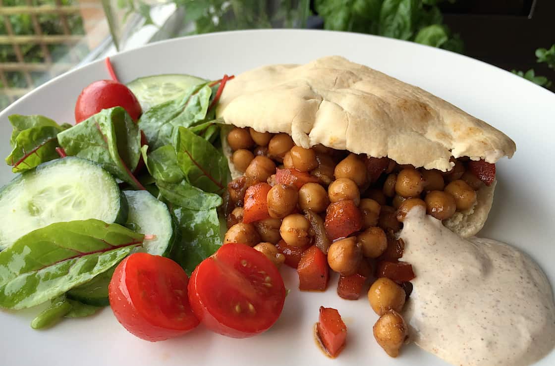 In de tussentijd warm je de pita’s op in de oven. Proef de kikkererwten en breng eventueel nog extra op smaak met peper en zout.